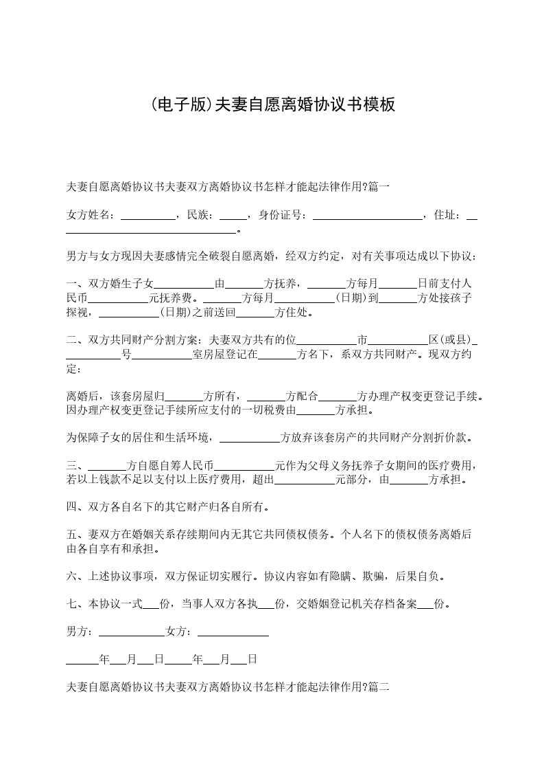 (1)本自愿离婚协议书一经双方签订即合法成立,经婚姻登记机关登记即具有法律效力。