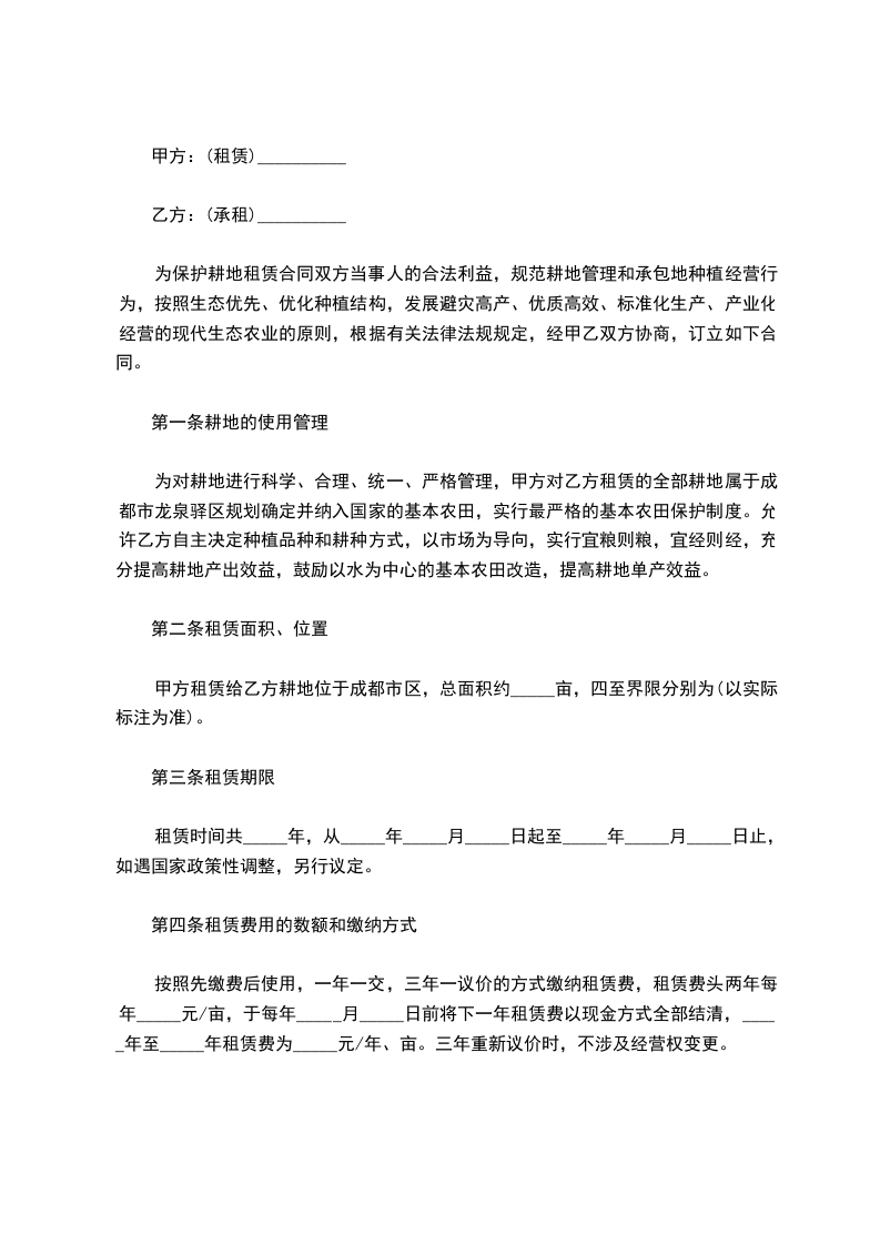 一甲方愿意将其承包的位于---------------------------------亩田地承包经营权转包[出租]给乙方,从事------------------------------------生产经营。