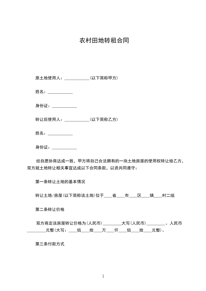 二田地转包[出租]期为-------年,自----------年-----月-------日至---------年-------月------日。自甲方交付之日起计算,期满后若乙方仍有承租意愿则双方另行协商有关事宜,在同等条件下乙方有优先承租权。
