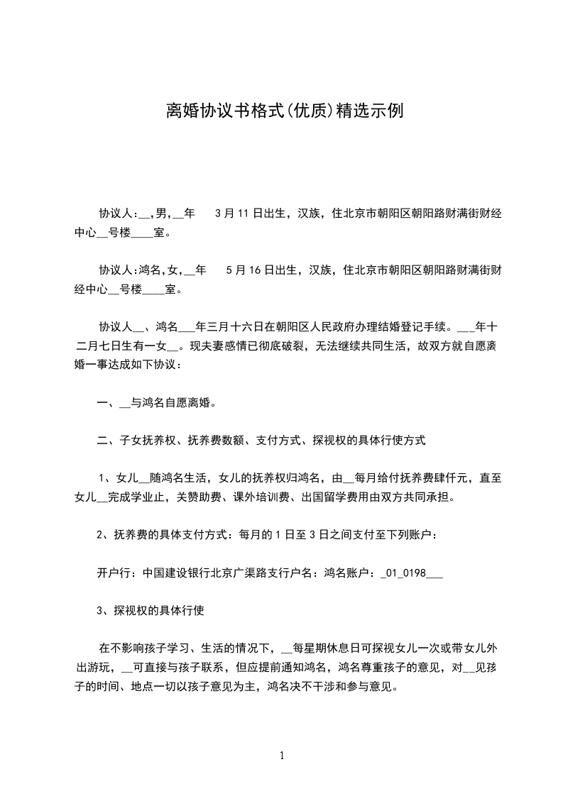 协议人:鸿名,女,__年5月16日出生,汉族,住北京市朝阳区朝阳路财满街财经中心__号楼____室。