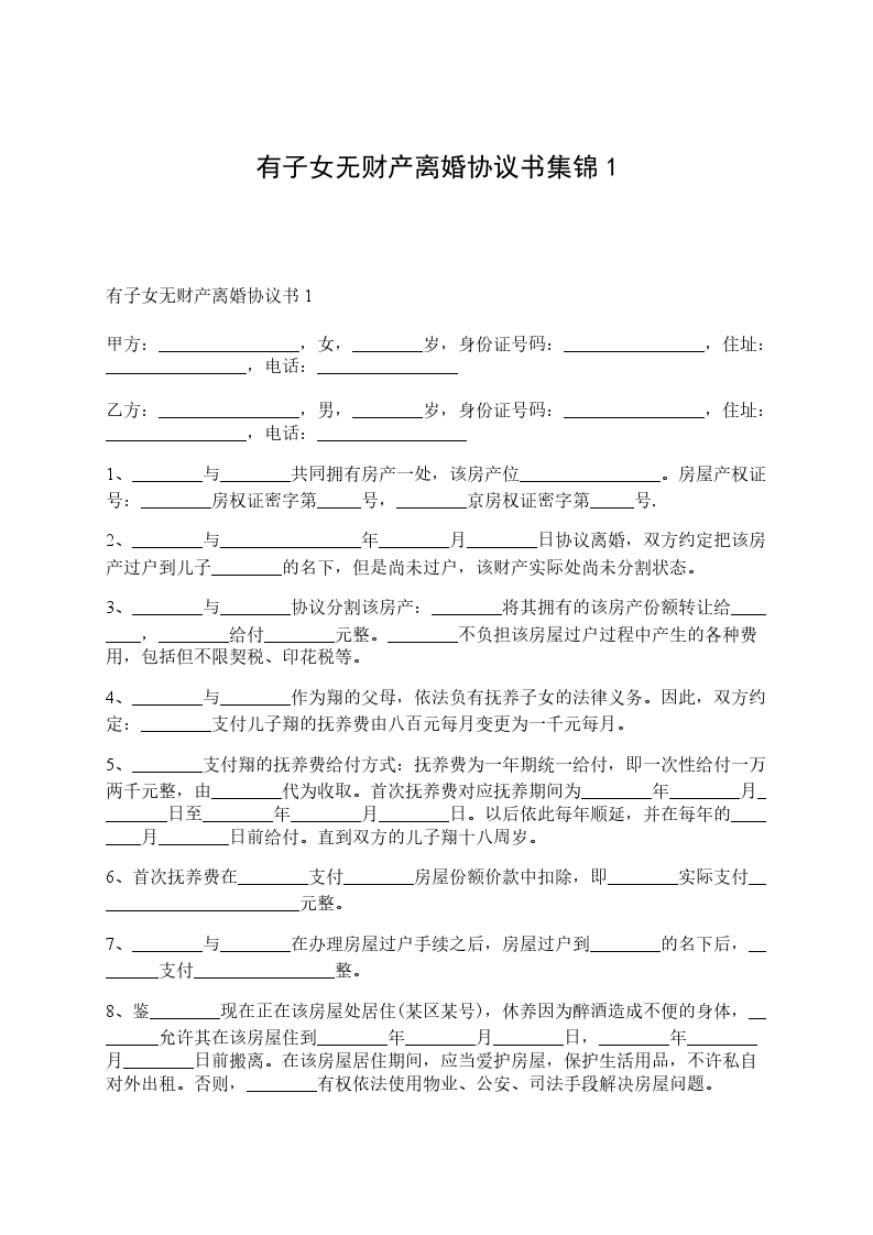 男、女双方2___年 __月__日办理结婚登记,婚后未生育子女。因双方性格不合,无法继续共同生活,夫妻感情完全破裂,已无跟好可能。现男女双方本着平等、自愿原则,经协商一致,就双方自愿离婚一事达成协议如下:
