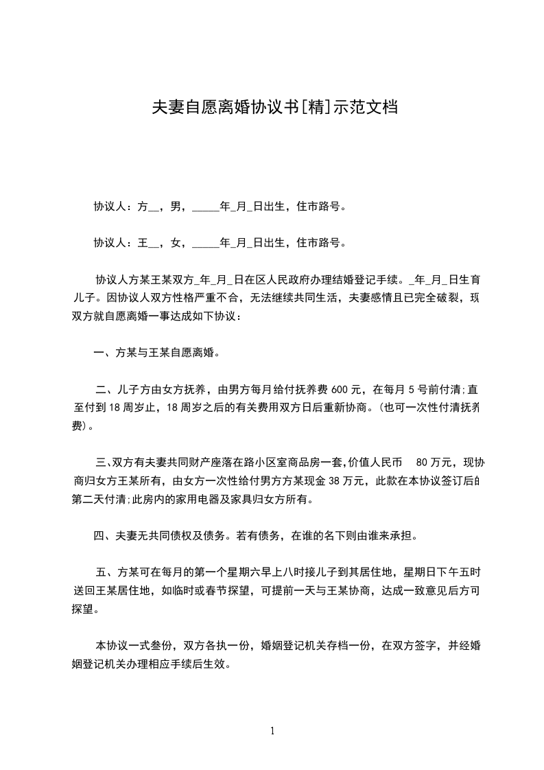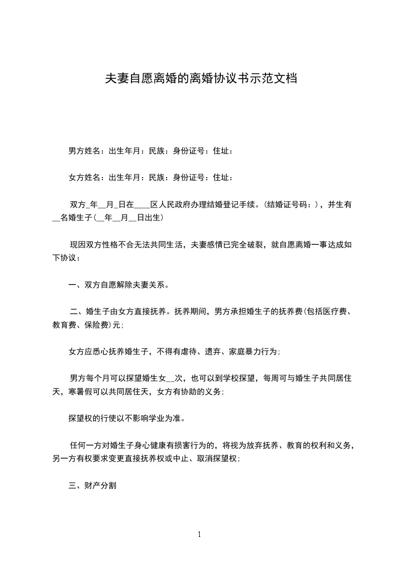 男方与女方______年____月相识,并______年____月____日在_________民政局登记结婚,婚后______年____月____日生育一儿子/女儿,名_________。因____________________________致使夫妻双方感情破裂,且已无任何和好可能,现经双方自愿协商达成一致意见,订立离婚协议如下:
