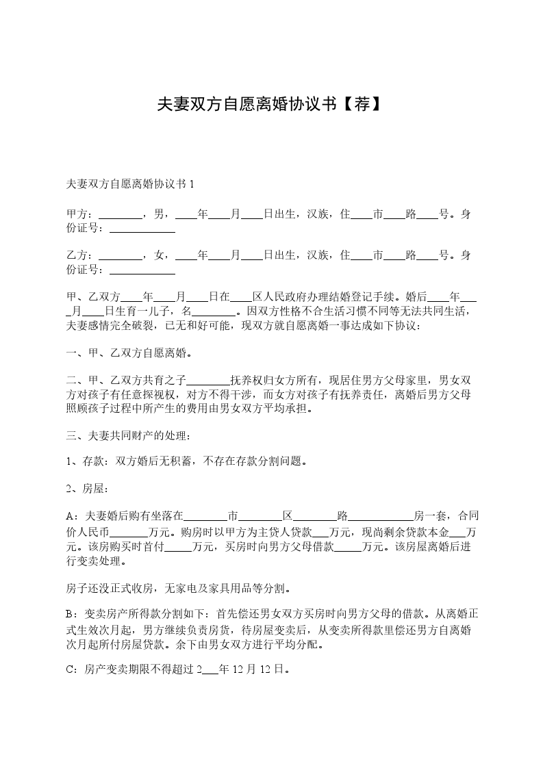 夫妻双方自愿离婚协议书3甲方:________,男,____年____月____日出生,汉族,住____市____路____号。身份证号:____________
