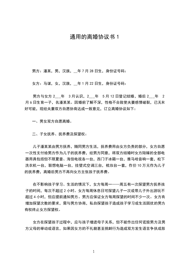 男方与女方2___年 3月认识,2___年 5月12日登记结婚,婚后2___年 2月6日生育一子,名潘某某。因婚前了解不深,性格不合致使夫妻感情破裂,已无和好可能,现经夫妻双方自愿协商达成一致意见,订立离婚协议如下:
