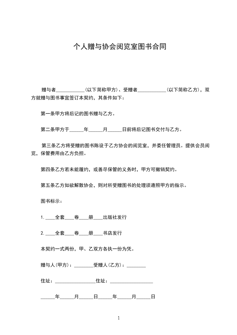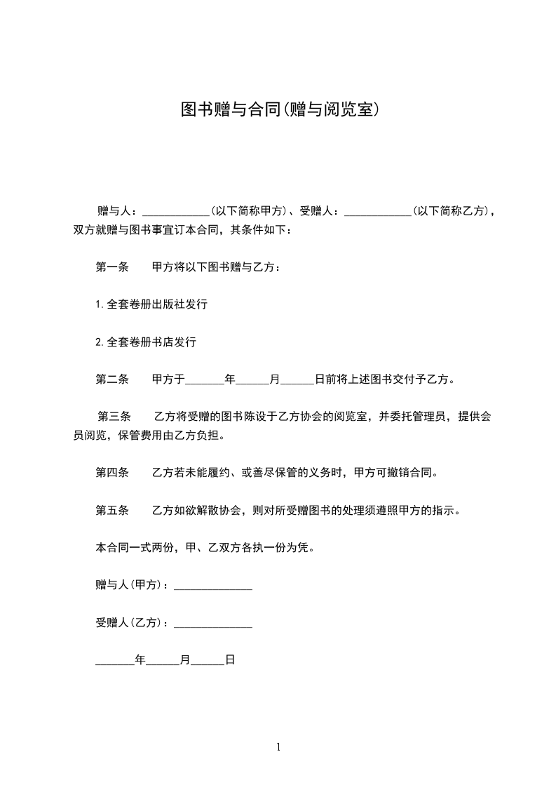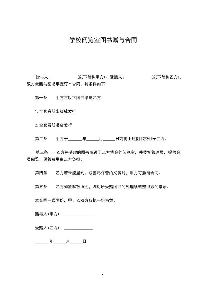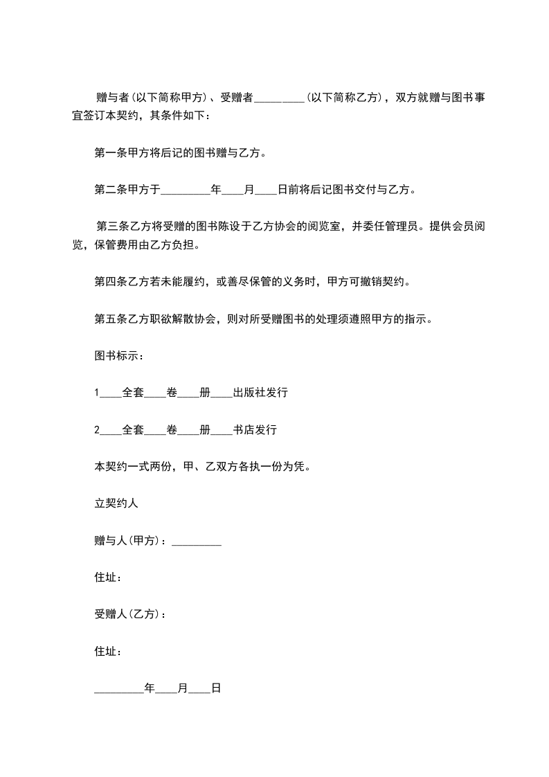 赠与者(以下简称甲方)、受赠者_________(以下简称乙方),双方就赠与图书事宜签订本契约,其条件如下: