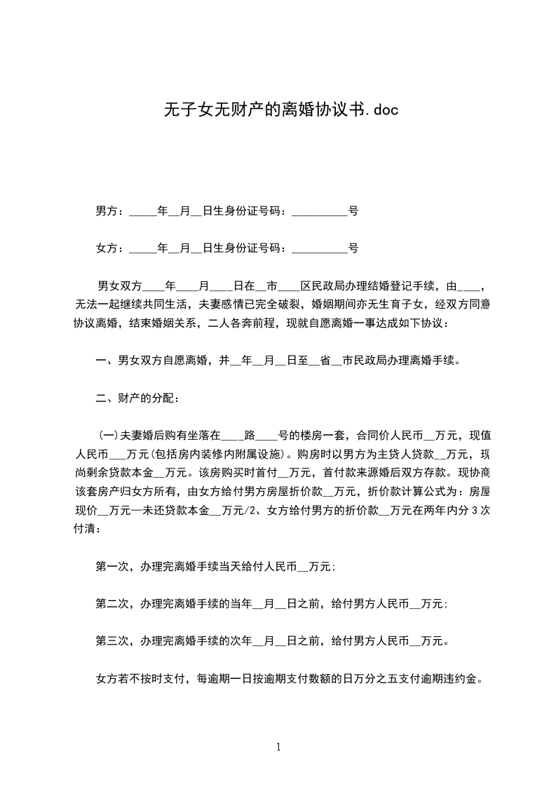 协议人双方__年__月__日登记结婚,__年__月__日生育一子,取名__。现协议双方夫妻感情已完全破裂,经双方协商一致,就自愿离婚、财产分割及子女抚养事宜达成如下协议: