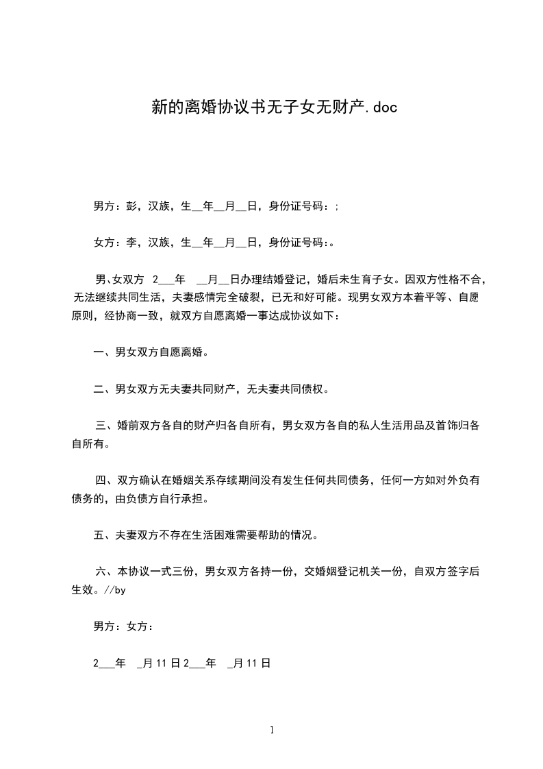 协议人:__男,__年__月__日出生,汉族,住__市__路__号