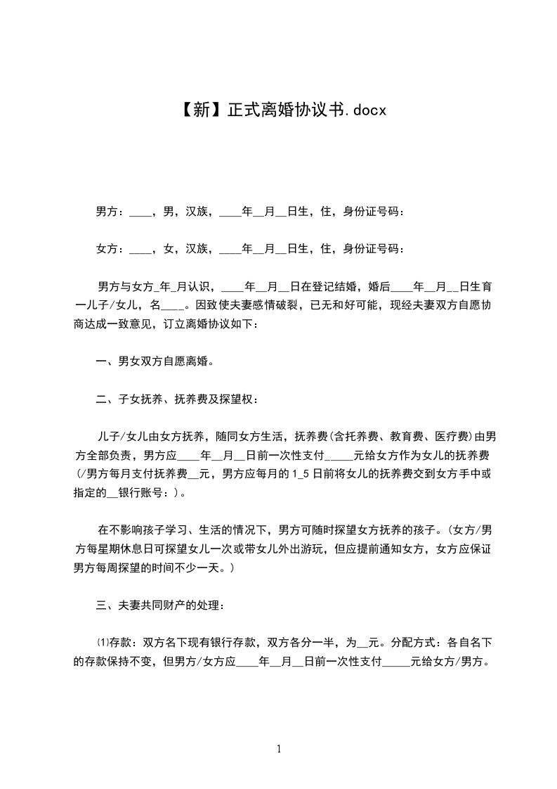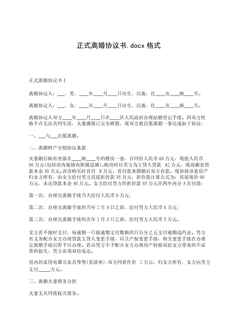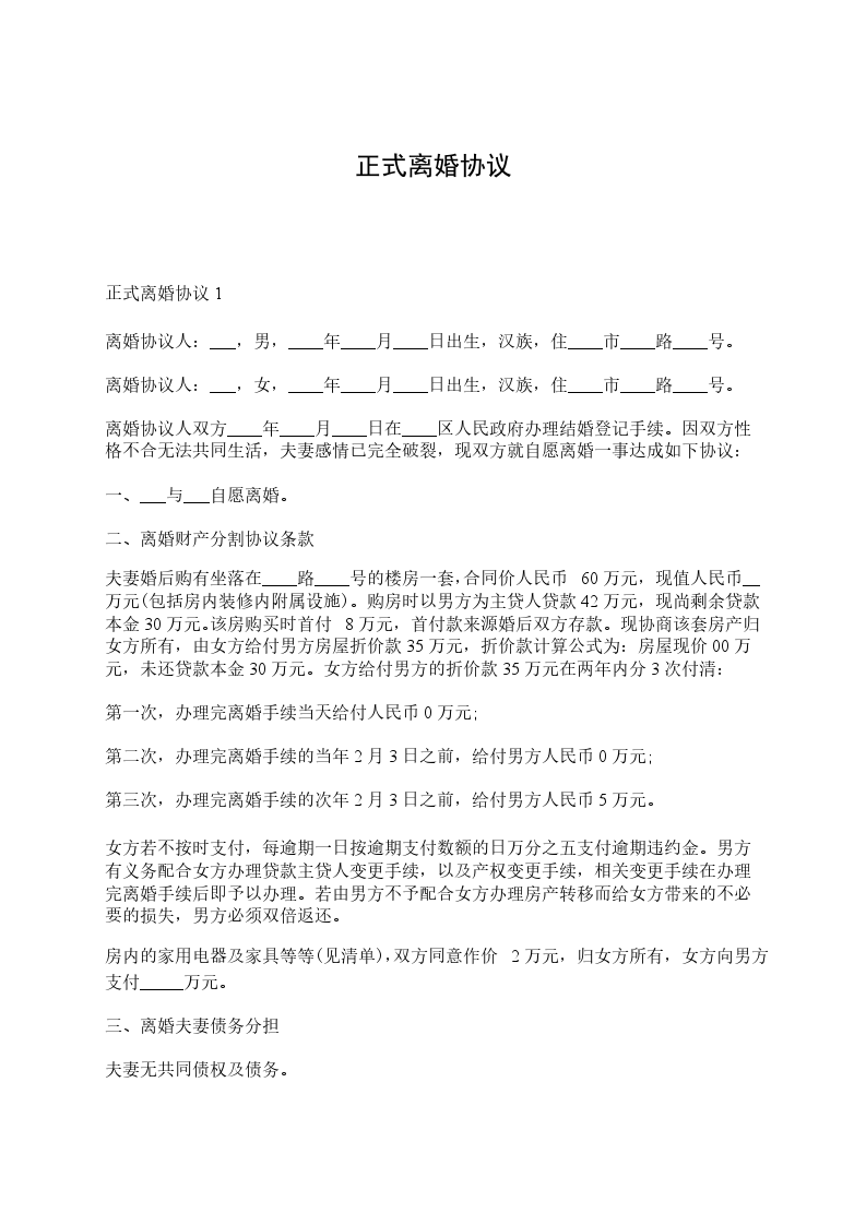1、经双方协商同意,男方共分割给女方人民币_____元整,其中_____万元本协议生效当时支付,其余_____万元_____年_____月_____日前支付,均以女方收款凭条为证。