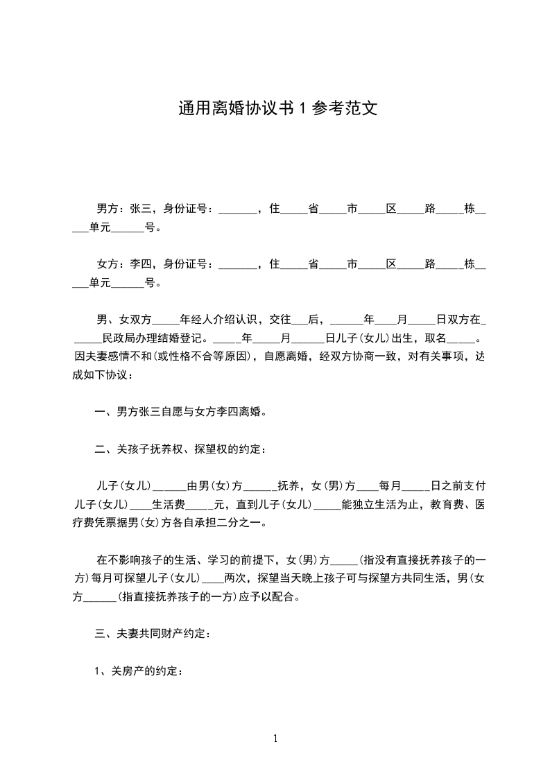 男方:张三,身份证号:_______,住_____省_____市_____区_____路_____栋_____单元______号。