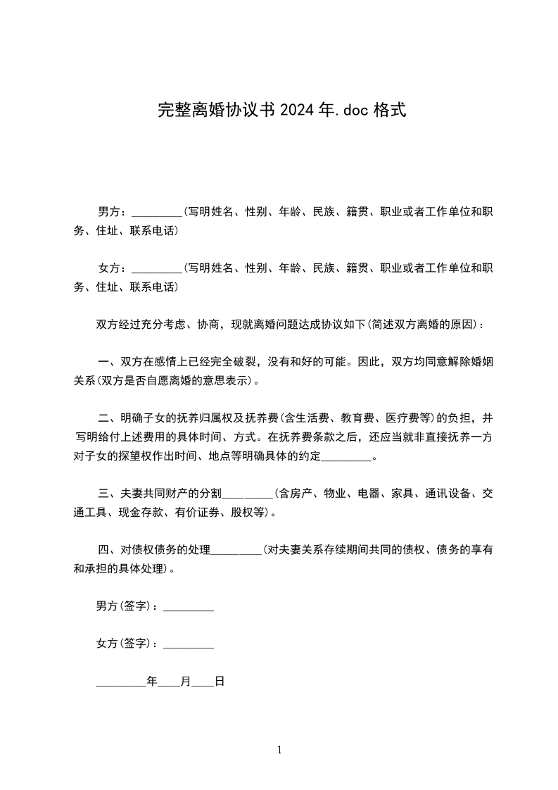男方:_________(写明姓名、性别、年龄、民族、籍贯、职业或者工作单位和职务、住址、联系电话)