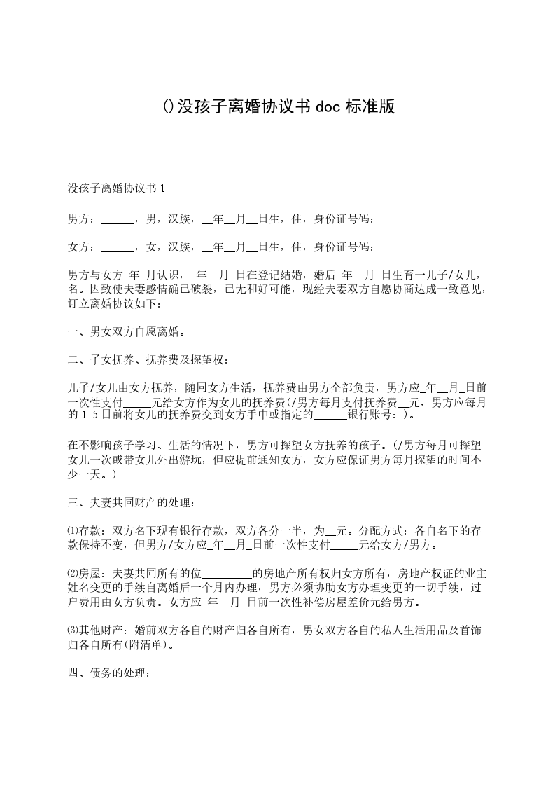 没孩子离婚协议书4甲方(男方)姓名:______性别:_____身份证号码:_____住址:_____