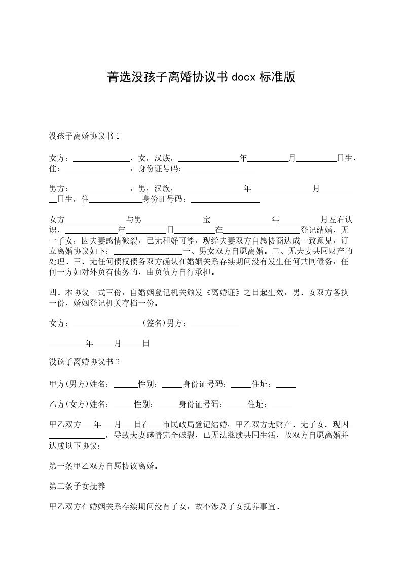 没孩子离婚协议书2男方:某某,男,汉族,____年__月__日生,住______,身份证号码:____