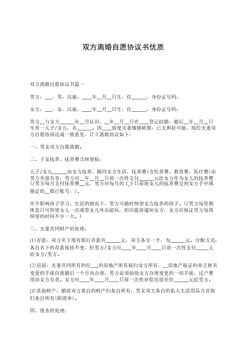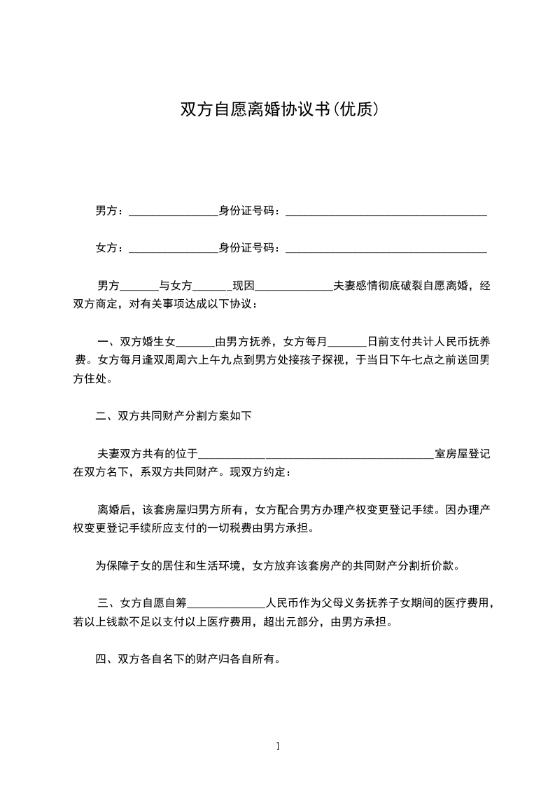 当事人:男方:,________年龄:,民族:,职业:,身份证号码:住址:。女方:,________年龄:,民族:,职业:,身份证号码:住址:。经商定,达成以下自愿离婚协议: