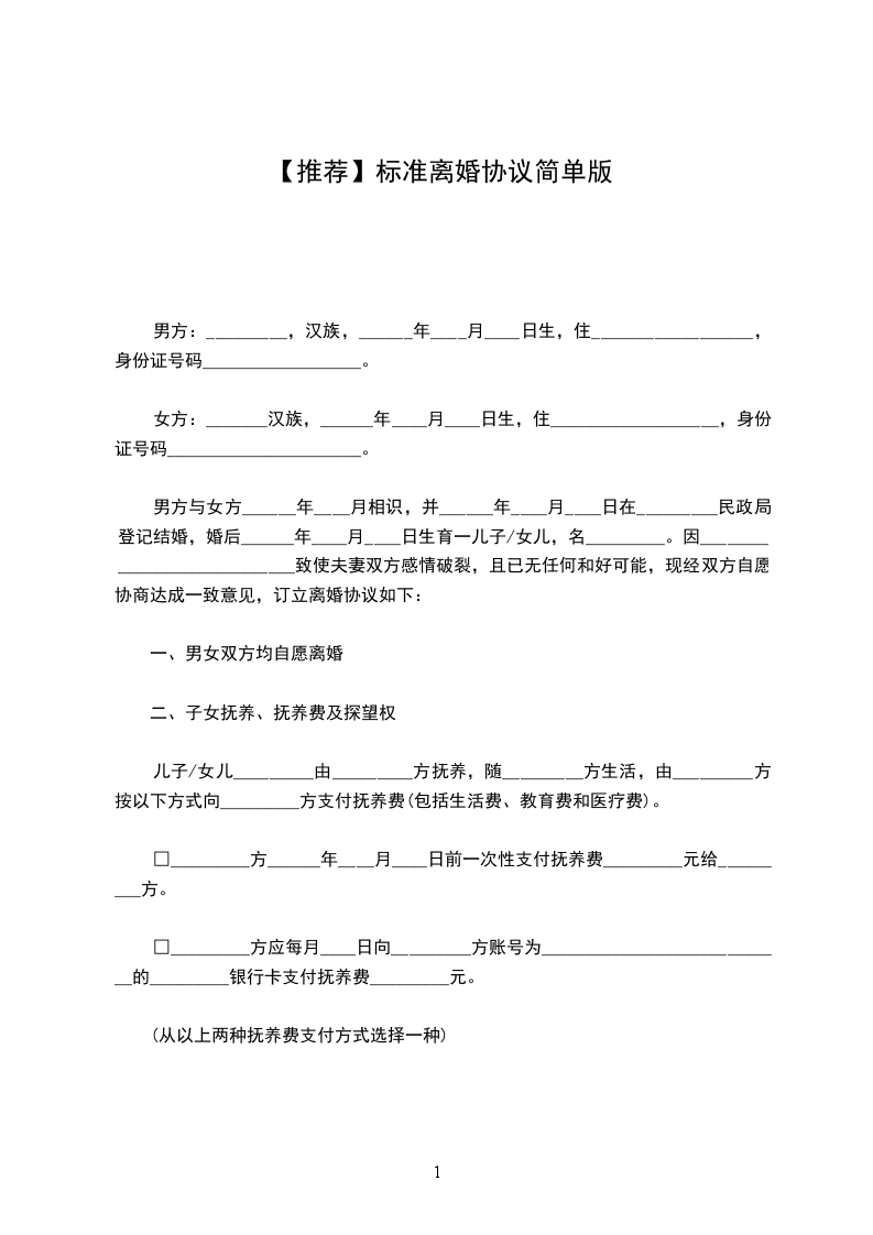 简单离婚协议书标准版篇二男方:,汉族,______年____月____日生,住____________________________,身份证号码__________________。女方:,汉族,__年__月__日生,住,身份证号码。