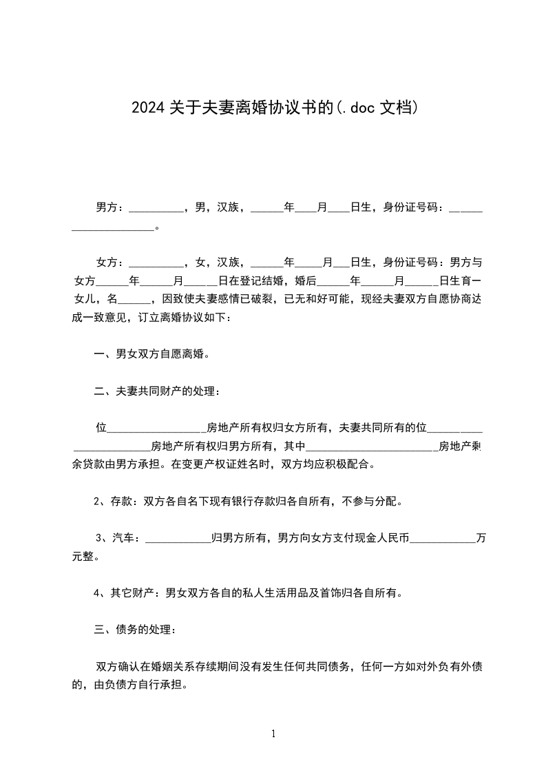 男女双方_________年_________月_________日结婚,_________年_________月生一女(子)_________,现就离婚事宜达成如下协议,供双方遵照执行: