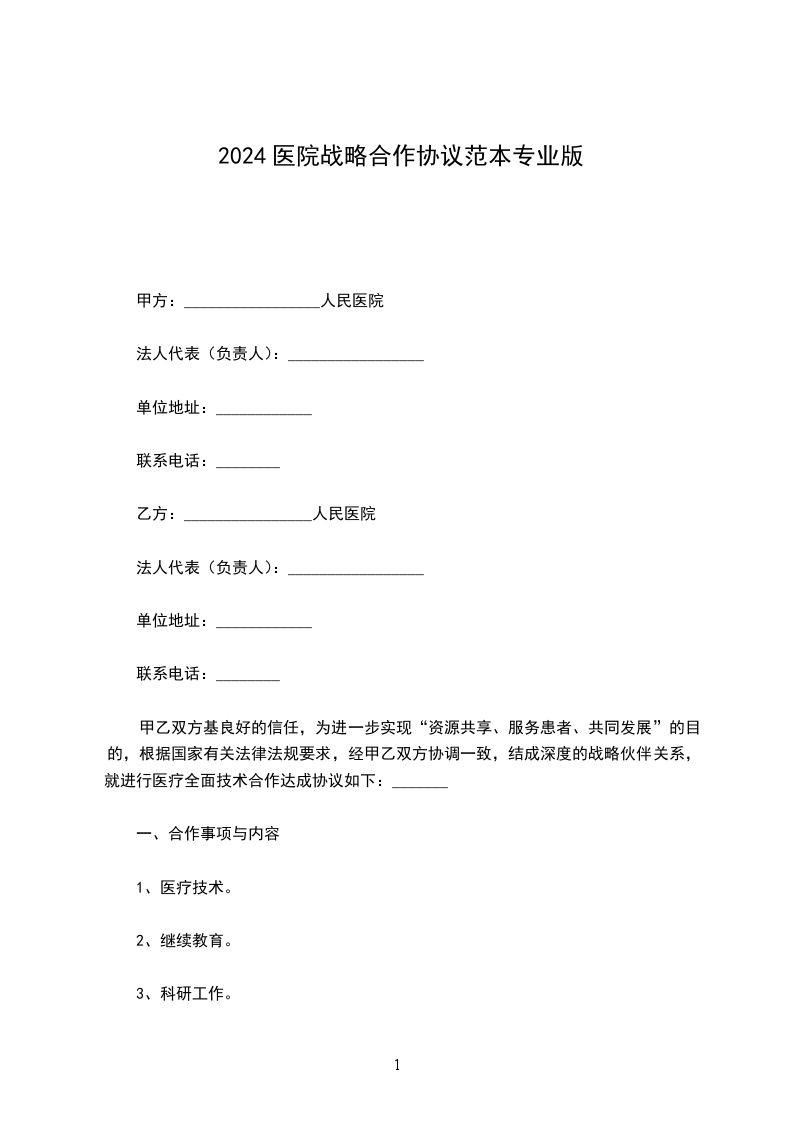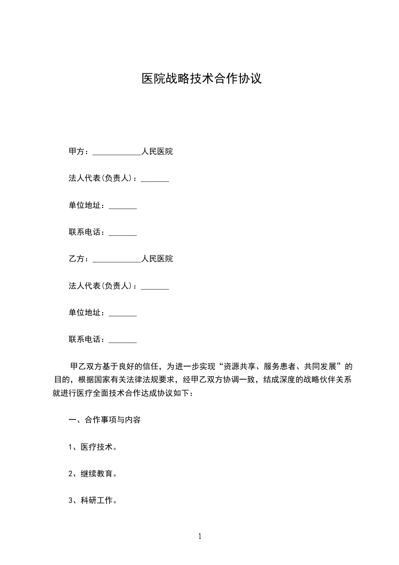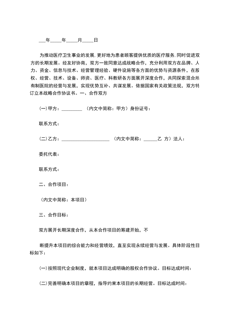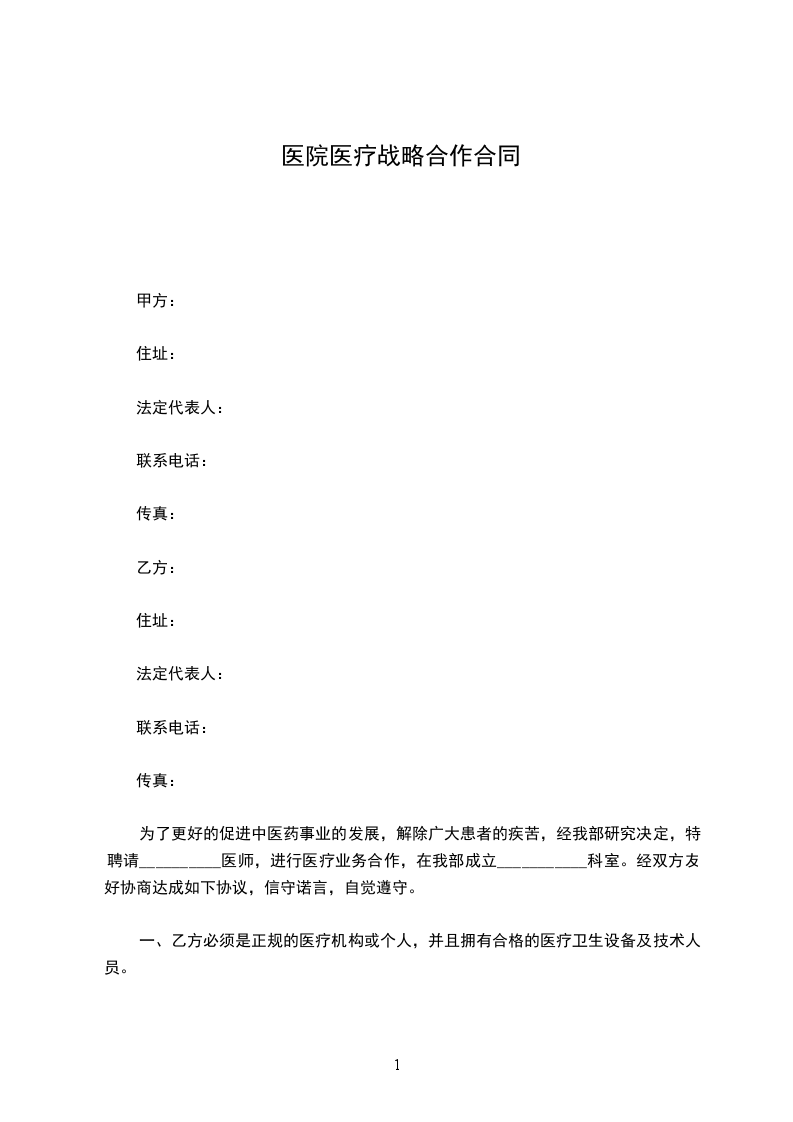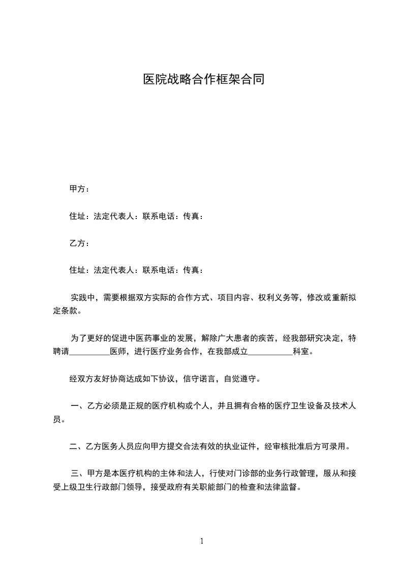 为了更好的促进中医药事业的发展,解除广大患者的疾苦,经我部研究决定,特聘请__________医师,进行医疗业务合作,在我部成立___________科室。经双方友好协商达成如下协议,信守诺言,自觉遵守。