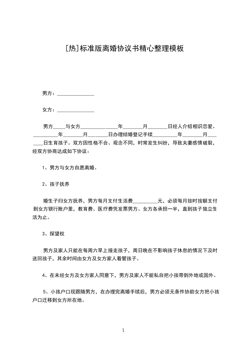 一、男女双方即日起同意离婚,并同意______年_____月_____日_____时至________省________市婚姻登记机关为自愿离婚之登记,离婚协议书范本。双方并同意事后男婚女嫁各不相干,并不得有干扰他方之行为。