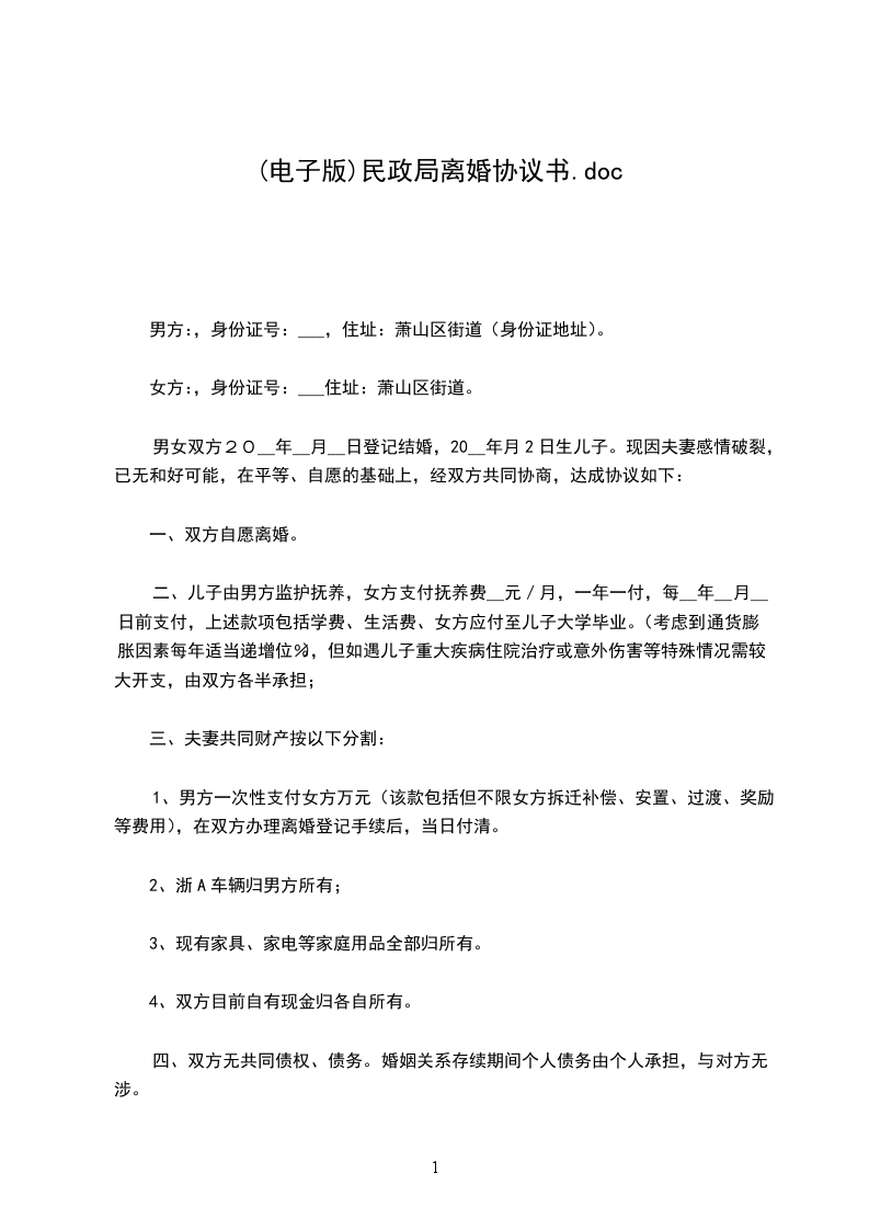 双方所生之子_______________(_______________年_______________月_______________日生,身份证号码:_______________)由女方监护,随女方生活。男方同意支付女方抚养子女所需费用每月人民币_______________元整,至儿子独立生活为止。男方签订本协议书时支付儿子生活费_______________元,以后男方应每年2月28日前支付_______________元,每年8月30日前支付_______________元。男方直接支付给女方或直接汇入女方设中国邮政储蓄账户之内。每次支付需要由女方出具收据或以汇款单为依据。一期迟延或未付者,视为全部到期,男方应一次付清所有子女抚养费。