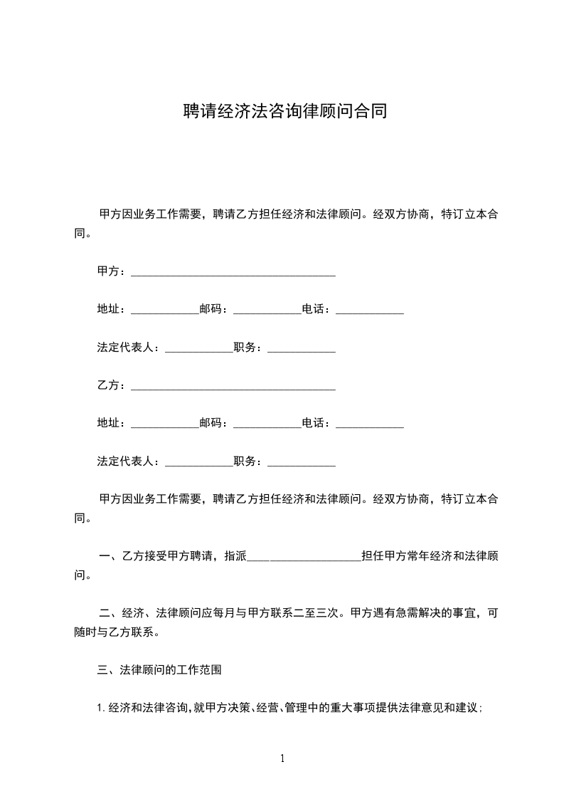 一、乙方接受甲方聘请,指派____________________担任甲方常年经济和法律顾问。