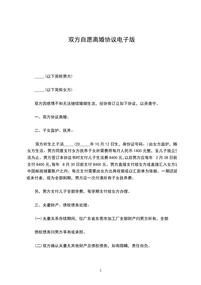 双方所生之子汤_____(20_____年10月12日生,身份证号码:)由女方监护,随女方生活。男方同意支付女方抚养子女所需费用每月人民币1400元整,至儿子独立生活为止。男方签订本协议书时支付儿子生活费8400元,以后男方应每年2月28日前支付8400元,每年8月30日前支付8400元。男方直接支付给女方或直接汇入女方设中国邮政储蓄账户之内。每次支付需要由女方出具收据或以汇款单为依据。一期迟延或未付者,视为全部到期,男方应一次付清所有子女抚养费。