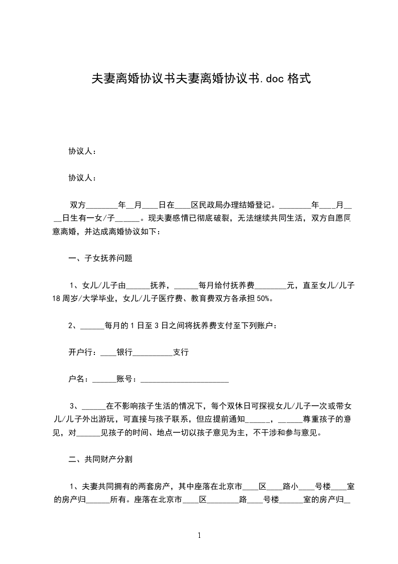 协议人双方_年__月_日登记结婚,__年__月__日生育一子,取名________。现协议双方夫妻感情已完全破裂,经双方协商一致,就自愿离婚、财产分割及子女抚养事宜达成如下协议:
