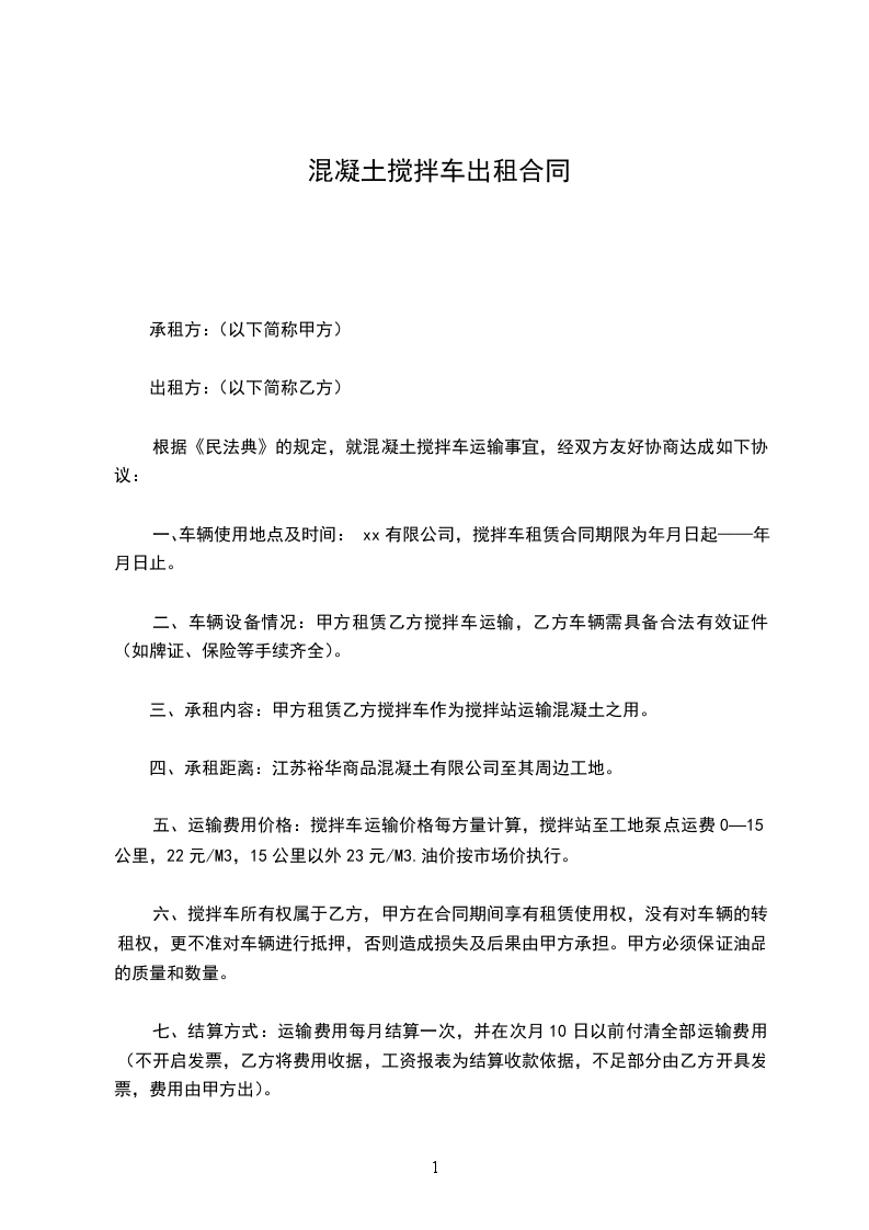 根据《民法典》的规定,就混凝土搅拌车运输事宜,经双方友好协商达成如下协议: