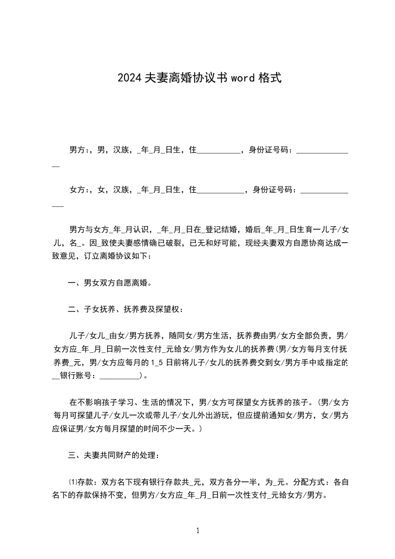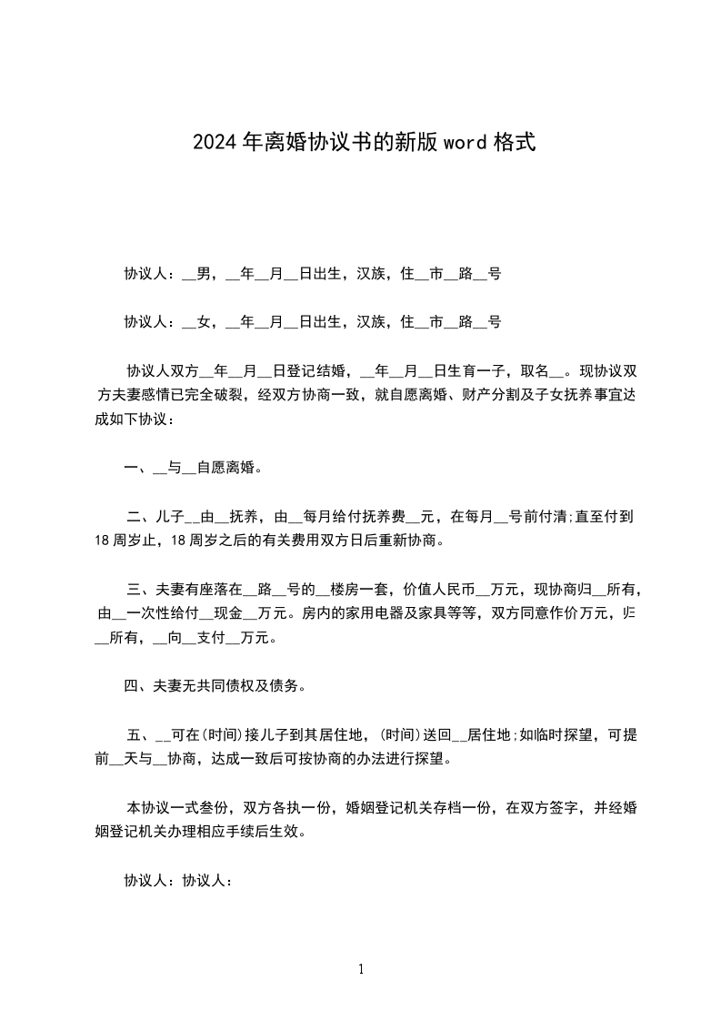 协议人双方__年__月__日登记结婚,__年__月__日生育一子,取名__。现协议双方夫妻感情已完全破裂,经双方协商一致,就自愿离婚、财产分割及子女抚养事宜达成如下协议: