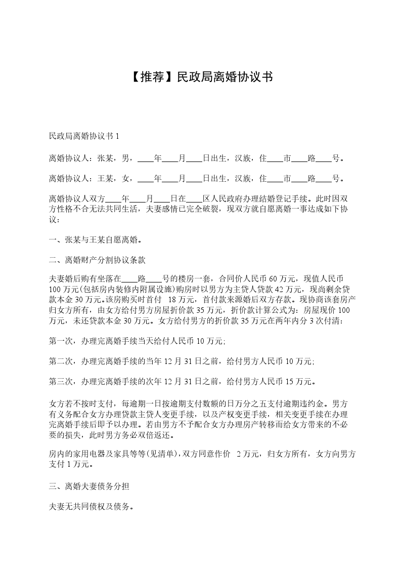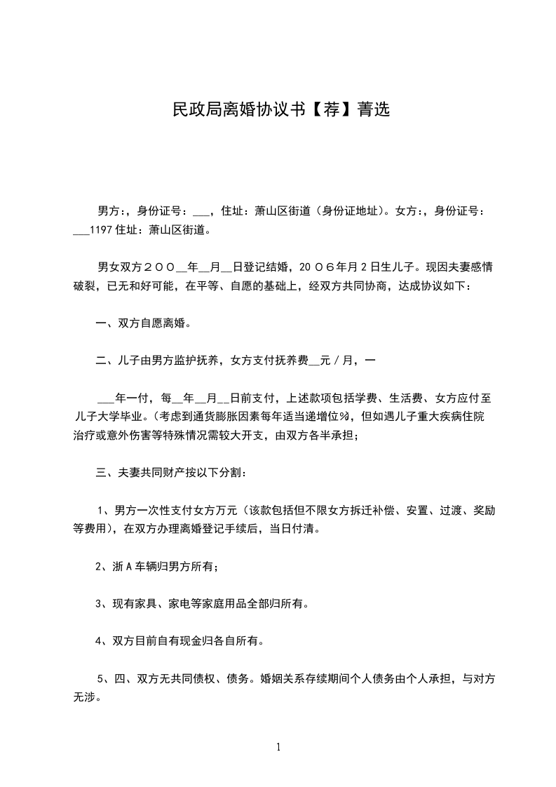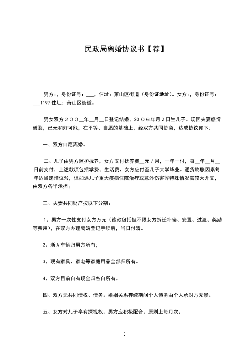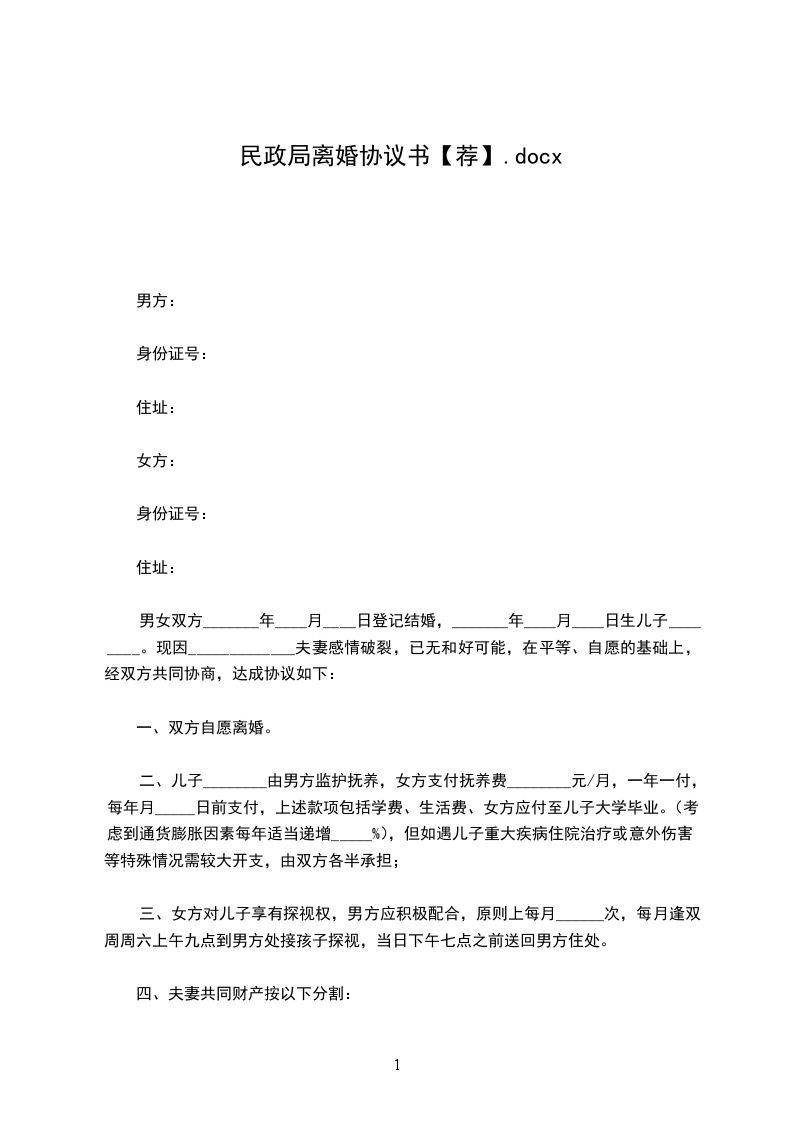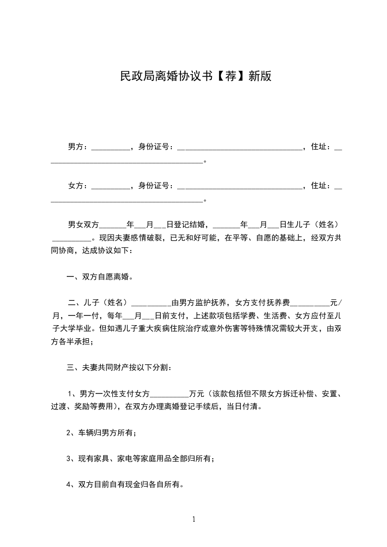 男方与女方_年_月认识,_年__月_日在登记结婚,婚后_年__月_日生育一儿子/女儿,名。因致使夫妻感情破裂,已无和好可能,现经夫妻双方自愿协商达成一致意见,订立离婚协议如下: