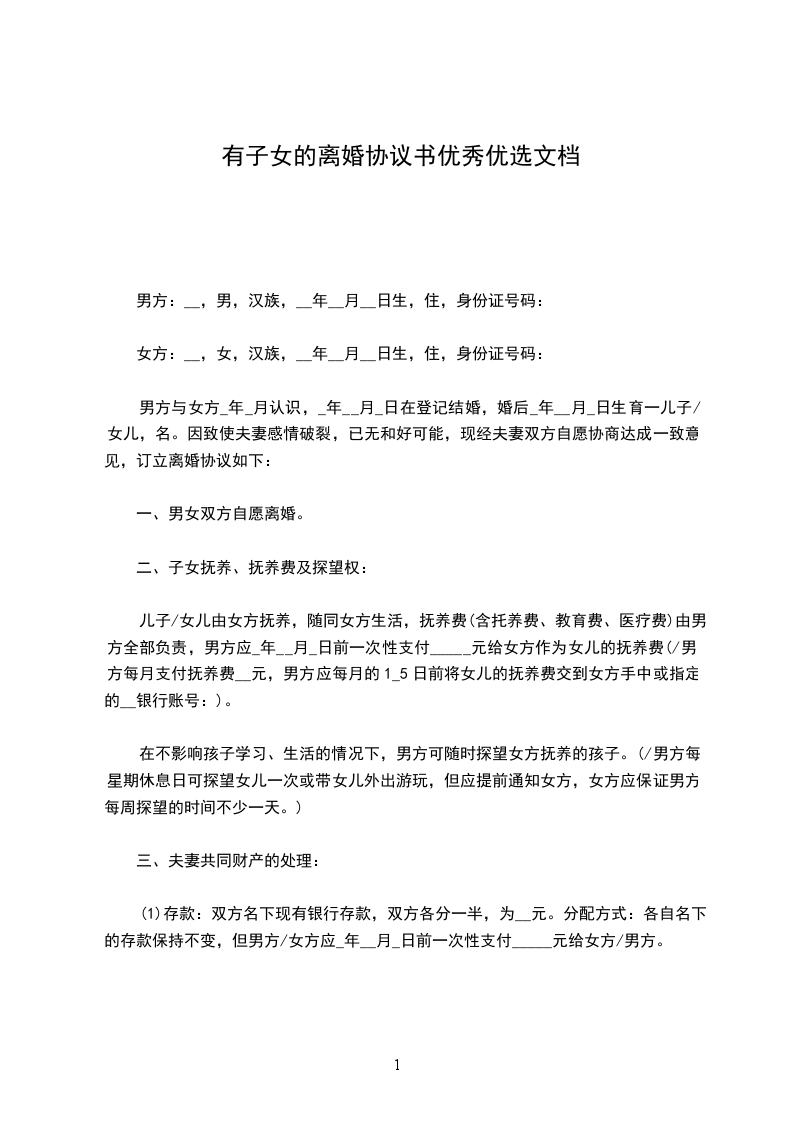 (1)存款:双方名下现有银行存款,双方各分一半,为__元。分配方式:各自名下的存款保持不变,但男方/女方应_年__月_日前一次性支付_____元给女方/男方。