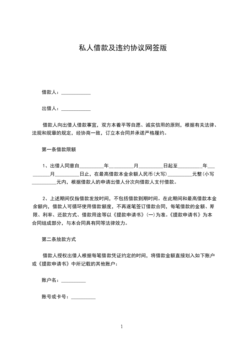 1、出借人同意自__________年__________月__________日起至__________年__________月__________日止,在最高借款本金余额人民币(大写)__________元整(小写)__________元内,根据借款人的申请出借人分次向借款人支付借款。