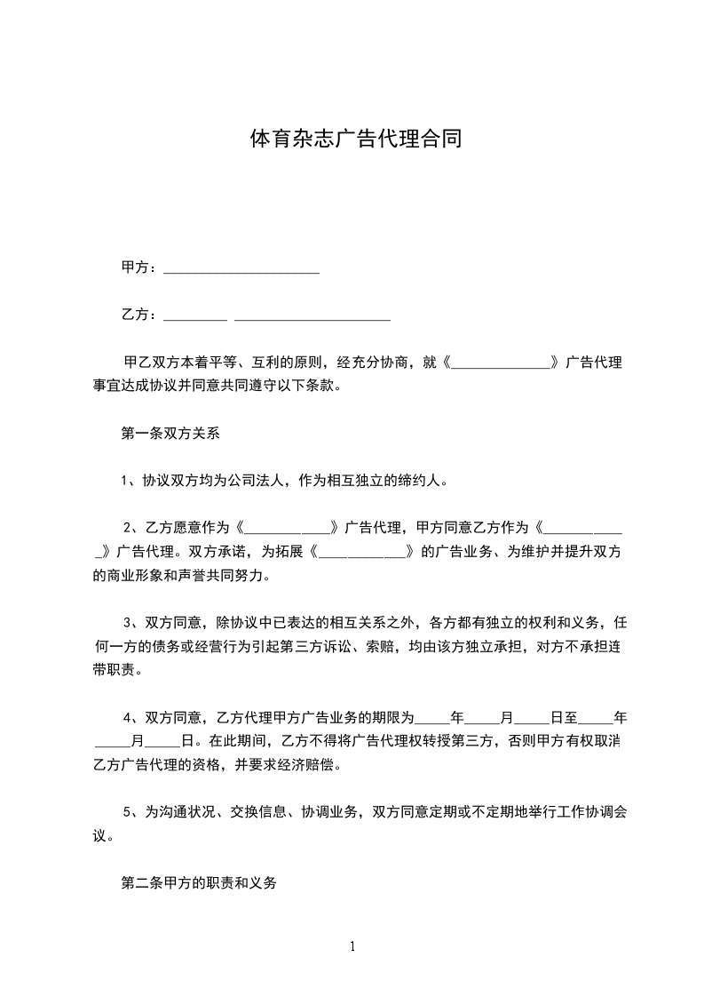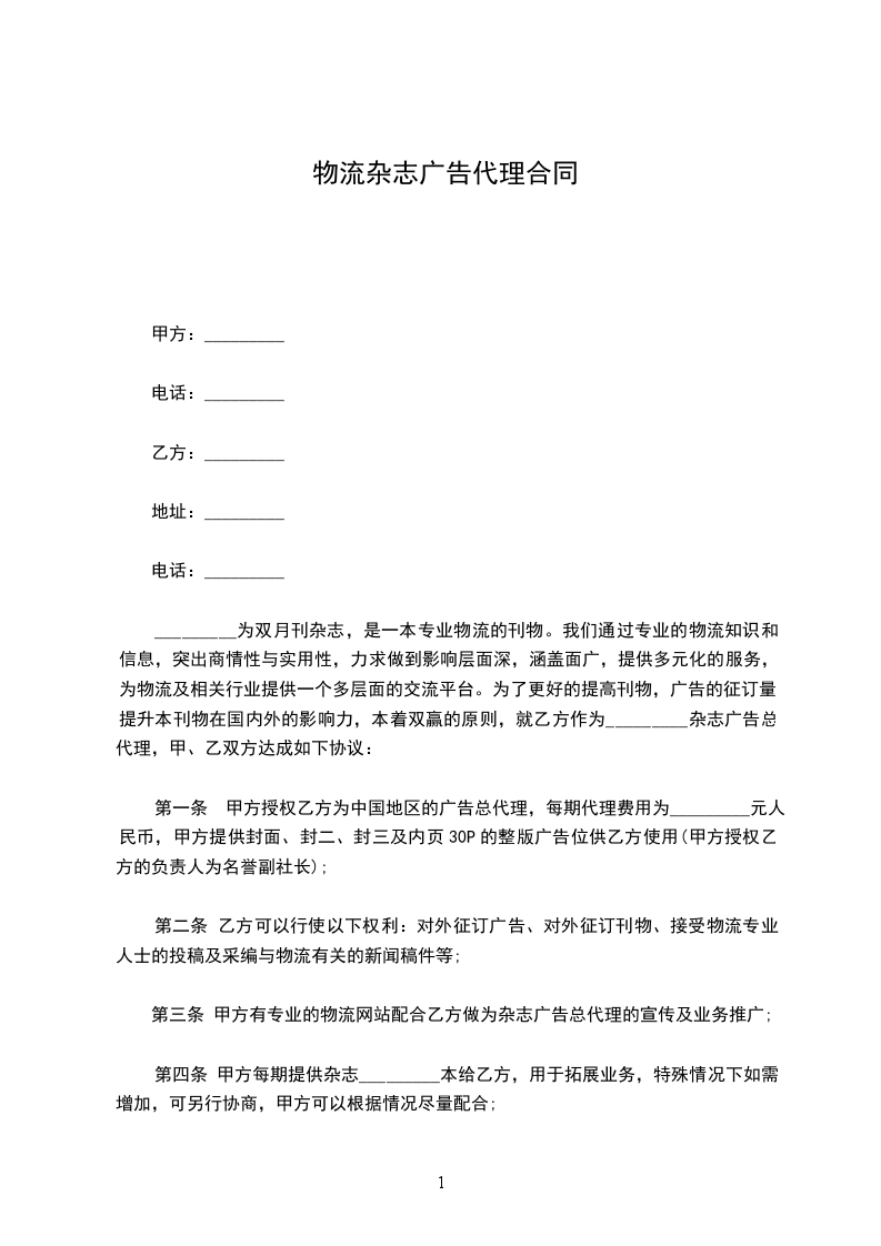 _________为双月刊杂志,是一本专业__________的刊物。我们通过专业的__________知识和信息,突出商情性与实用性,力求做到影响层面深,涵盖面广,提供多元化的服务,为__________及相关行业提供一个多层面的交流平台。为了更好的提高刊物,广告的征订量,提升本刊物在国内外的影响力,本着双赢的原则,就乙方作为_________杂志广告总代理,甲、乙双方达成如下协议: