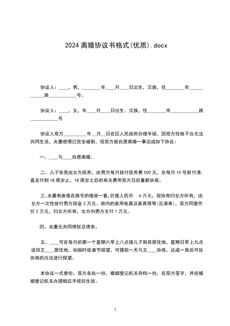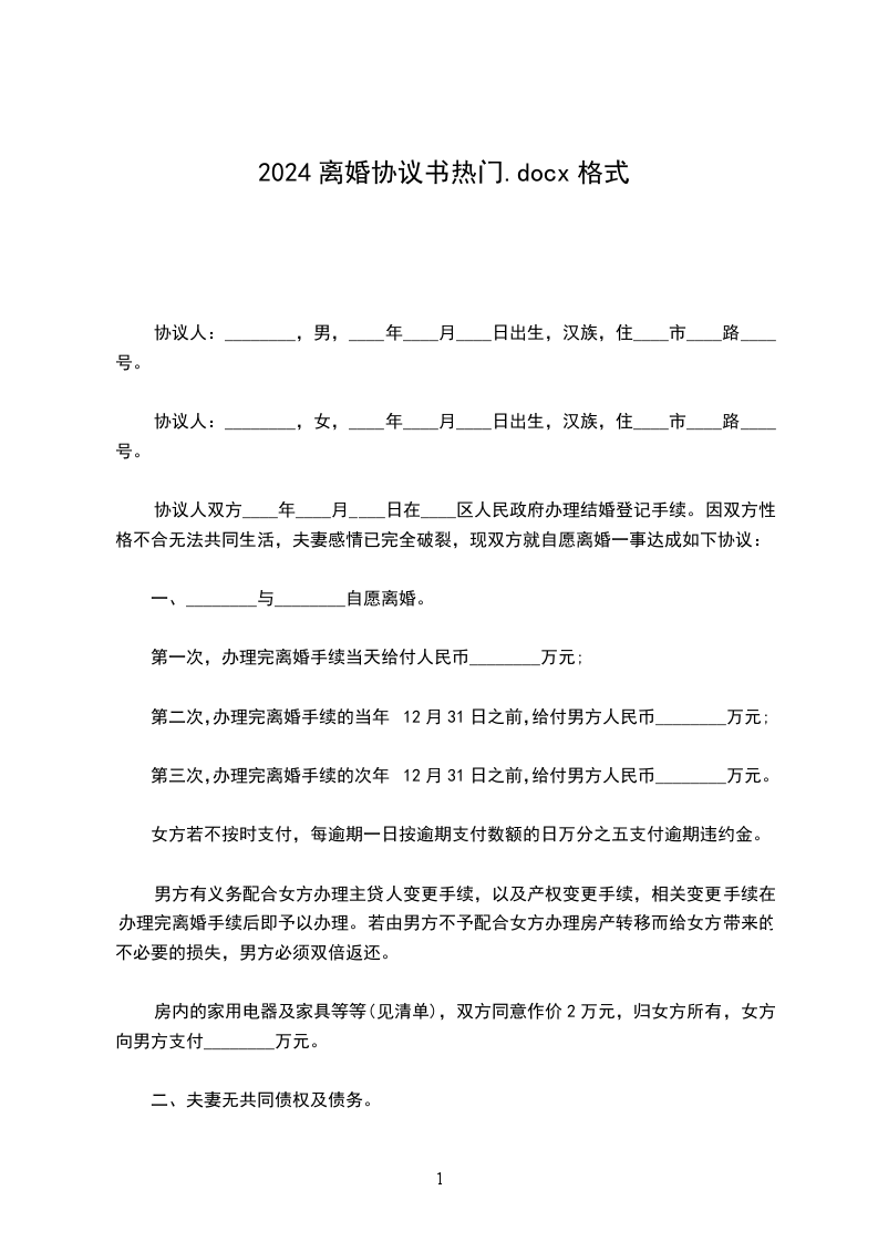1、经双方协商同意,男方共分割给女方人民币_____元整,其中_____万元本协议生效当时支付,其余_____万元_____年_____月_____日前支付,均以女方收款凭条为证。