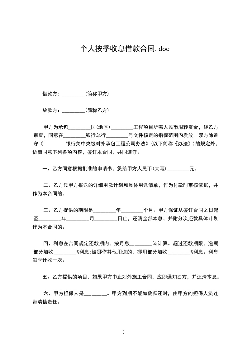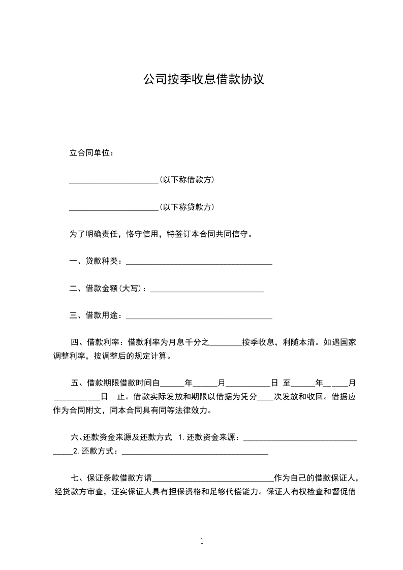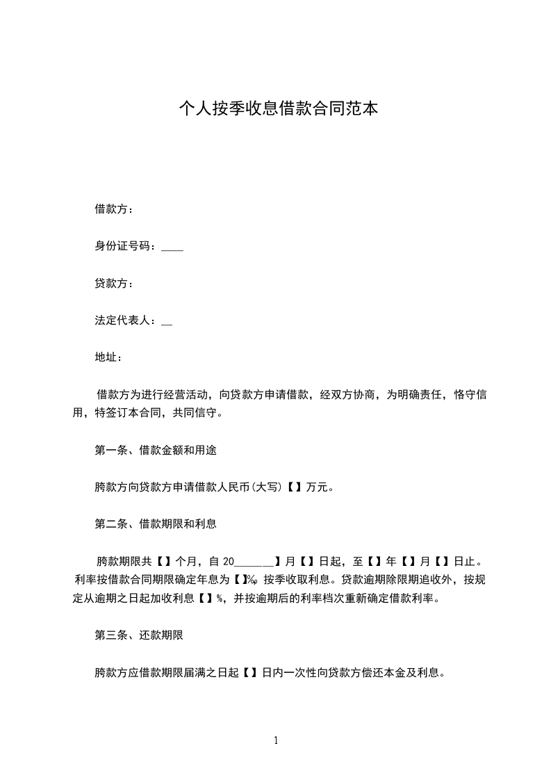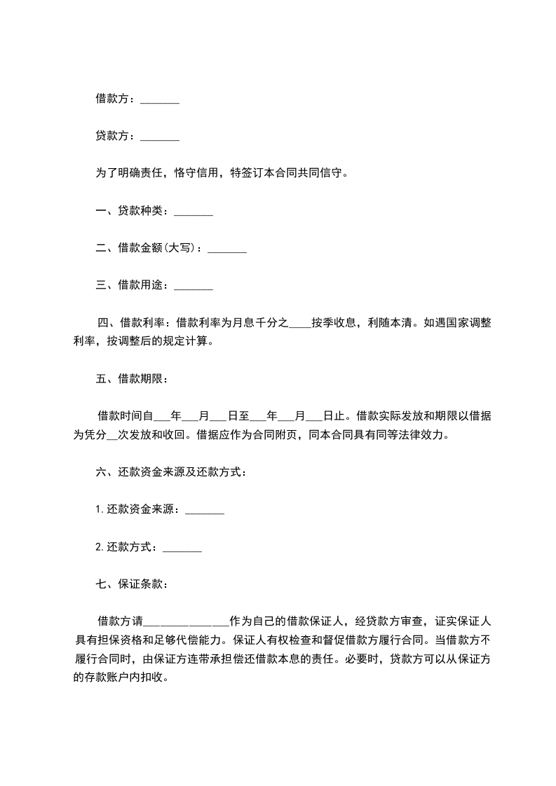 胯款期限共【】个月,自20_______】月【】日起,至【】年【】月【】日止。利率按借款合同期限确定年息为【】‰,按季收取利息。贷款逾期除限期追收外,按规定从逾期之日起加收利息【】%,并按逾期后的利率档次重新确定借款利率。