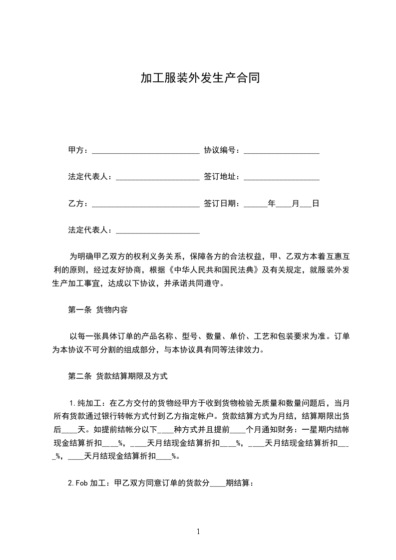 为明确甲乙双方的权利义务关系,保障各方的合法权益,甲、乙双方本着互惠互利的原则,经过友好协商,根据《中华人民共和国民法典》及有关规定,就服装外发生产加工事宜,达成以下协议,并承诺共同遵守。