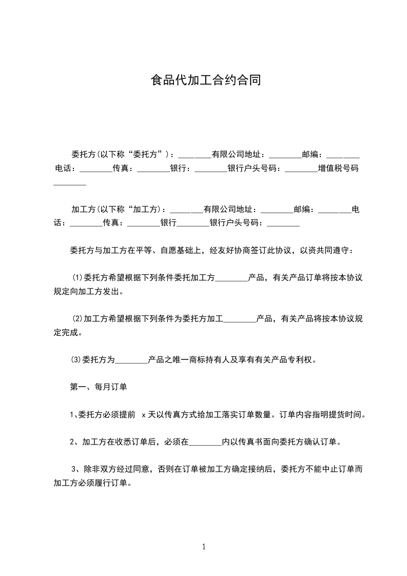 加工方(以下称“加工方):________有限公司地址:________邮编:________电话:________传真:________银行________银行户头号码:________