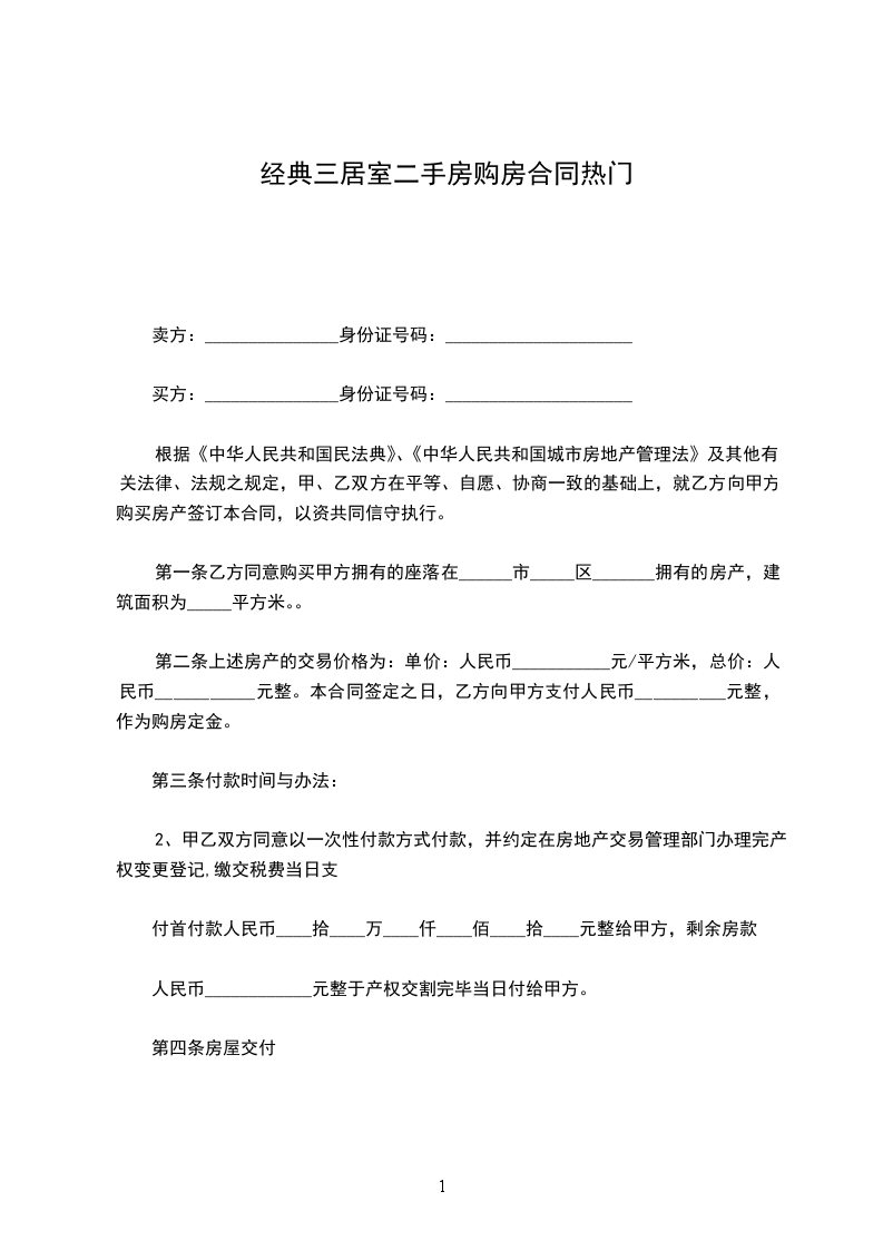 第二条上述房产的交易价格为:单价:人民币___________元/平方米,总价:人民币___________元整。本合同签定之日,乙方向甲方支付人民币__________元整,作为购房定金。