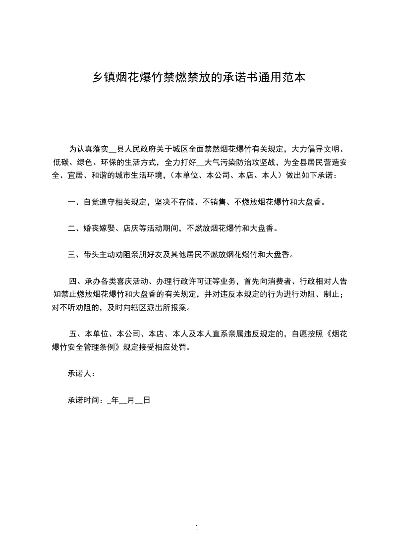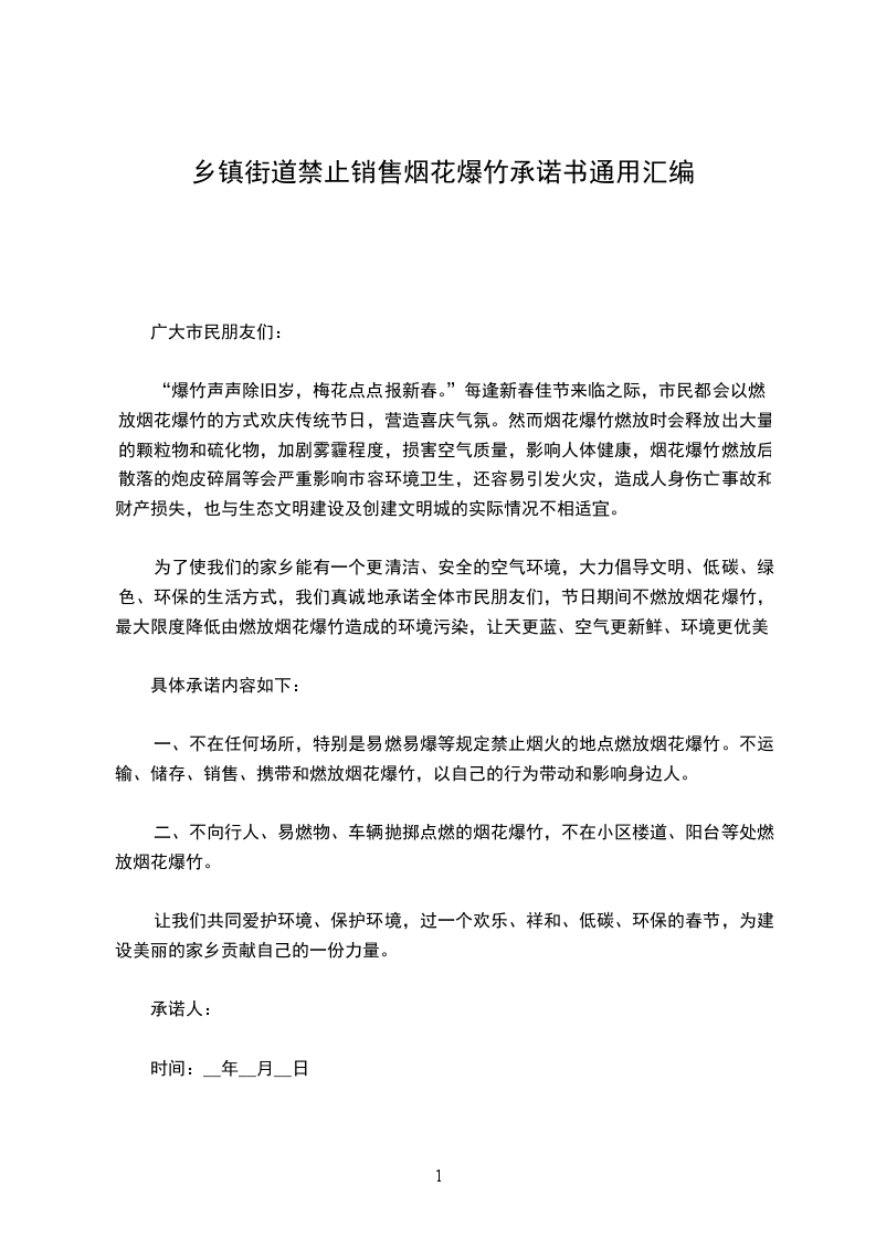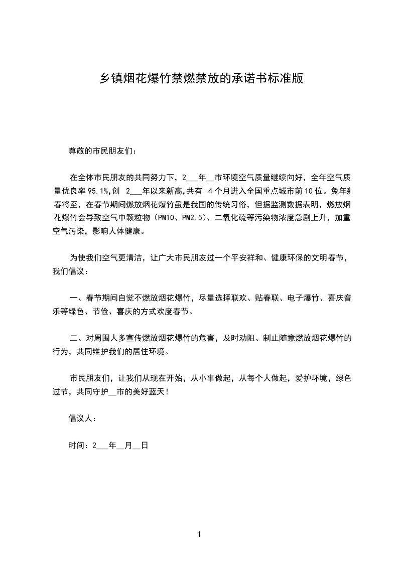 为了使我们的家乡能有一个更清洁、安全的空气环境,大力倡导文明、低碳、绿色、环保的生活方式,我们真诚地承诺全体市民朋友们,节日期间不燃放烟花爆竹,最大限度降低由燃放烟花爆竹造成的环境污染,让天更蓝、空气更新鲜、环境更优美。