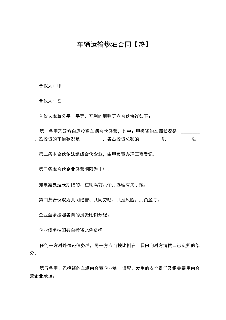 第一条甲乙双方自愿投资车辆合伙经营,其中:甲投资的车辆状况是:__________,乙投资的车辆状况是__________,各占投资总额的__________%、__________%。