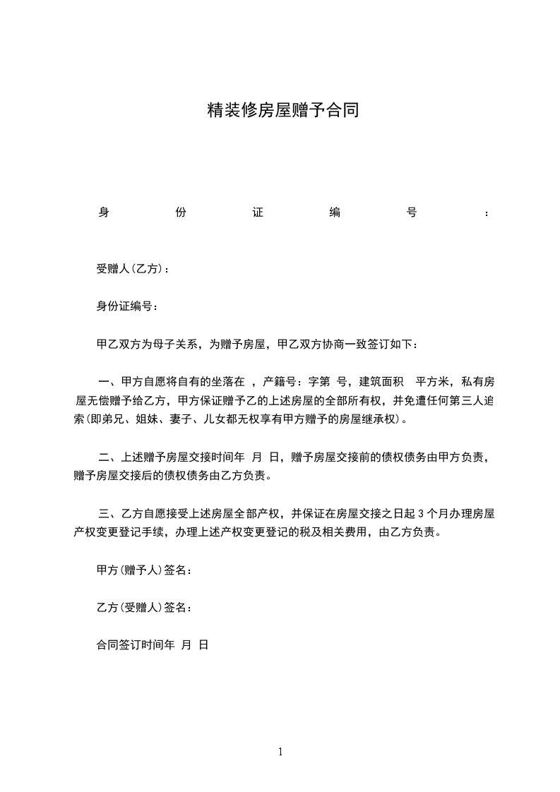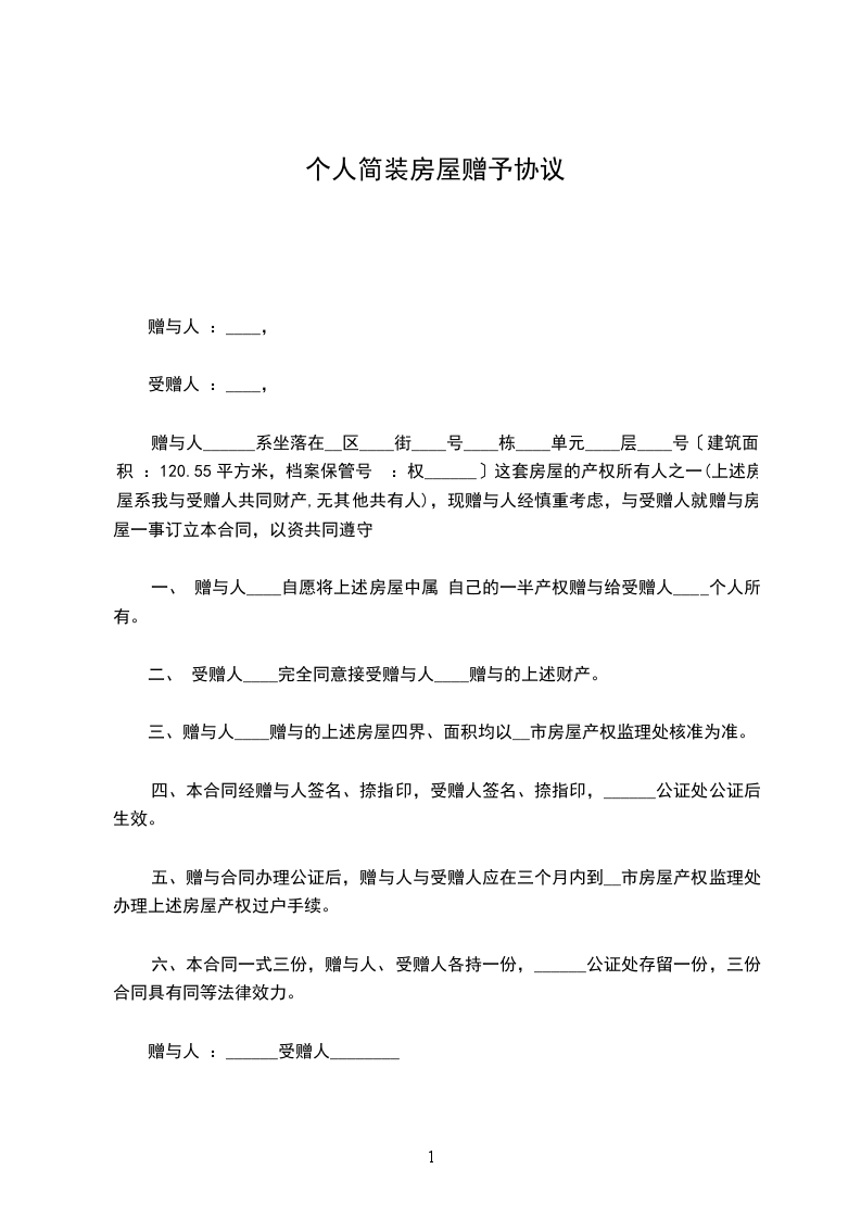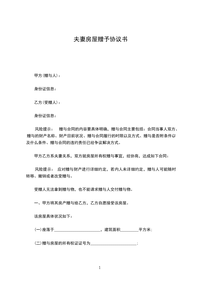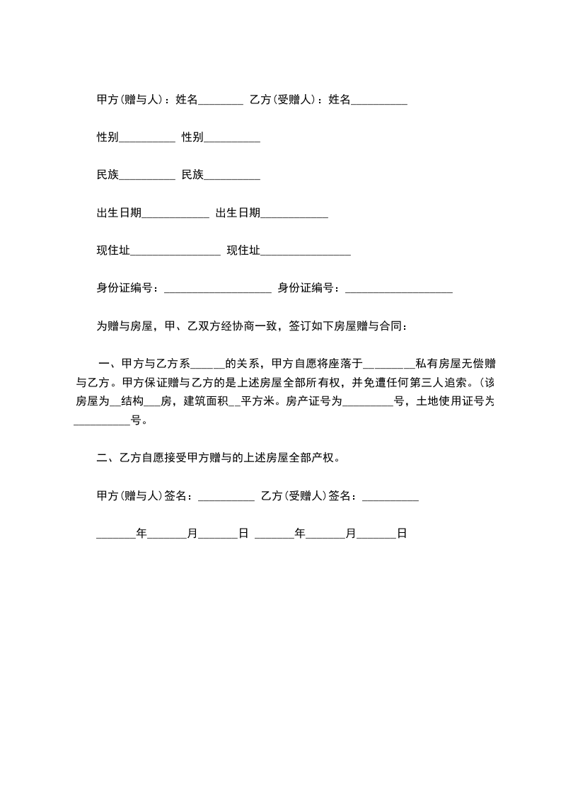 第一条:甲方自愿将其房产赠与给乙方,乙方自愿接受该房屋。该房屋具体状况如下: