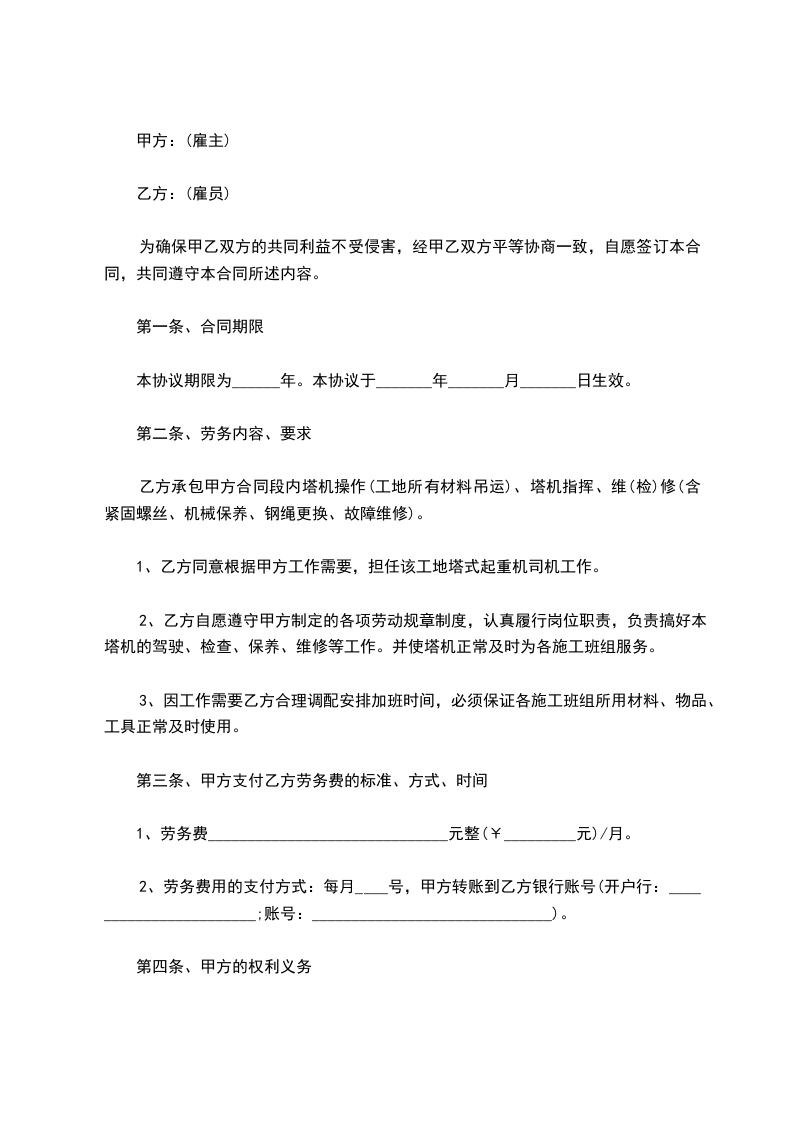3、认真履行本合同约定的内容,严格执行塔吊操作规程,搞好本职工作。按约定领取劳动报酬,按约定解除合同。