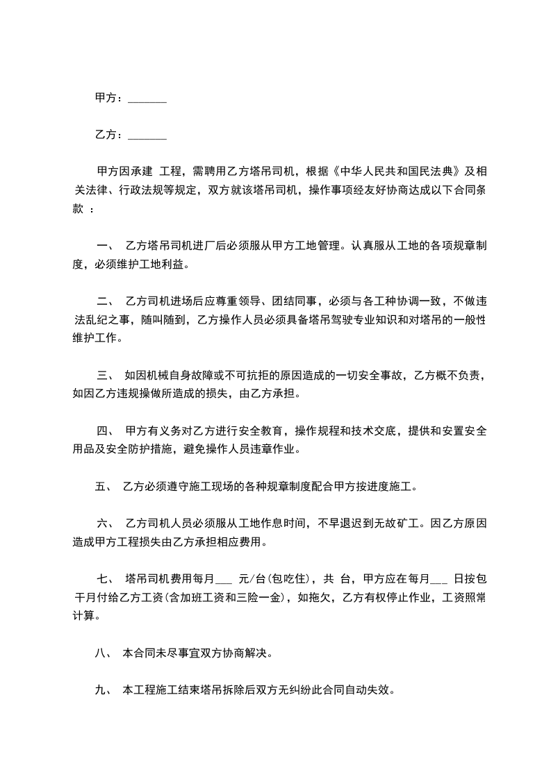 1、乙方同意根据甲方工作需要,担任该工地塔式起重机司机工作。