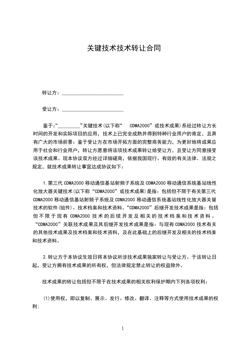 鉴于:“_________”关键技术(以下称“CDMA2000”或技术成果)系经过转让方长时间的开发和实际项目的应用,技术上已完全成熟并得到特种行业用户的肯定,且具有广大的市场前景:鉴于受让方在市场开拓方面的完整商务能力,为更好地将成果应用于社会和行业用户,转让方愿意将该项技术成果转让给受让方,且受让方同意接受该技术成果。现本协议双方经过详细磋商,依据我国现行、有效的有关法律、法规之规定,就技术成果转让事宜达成协议如下: