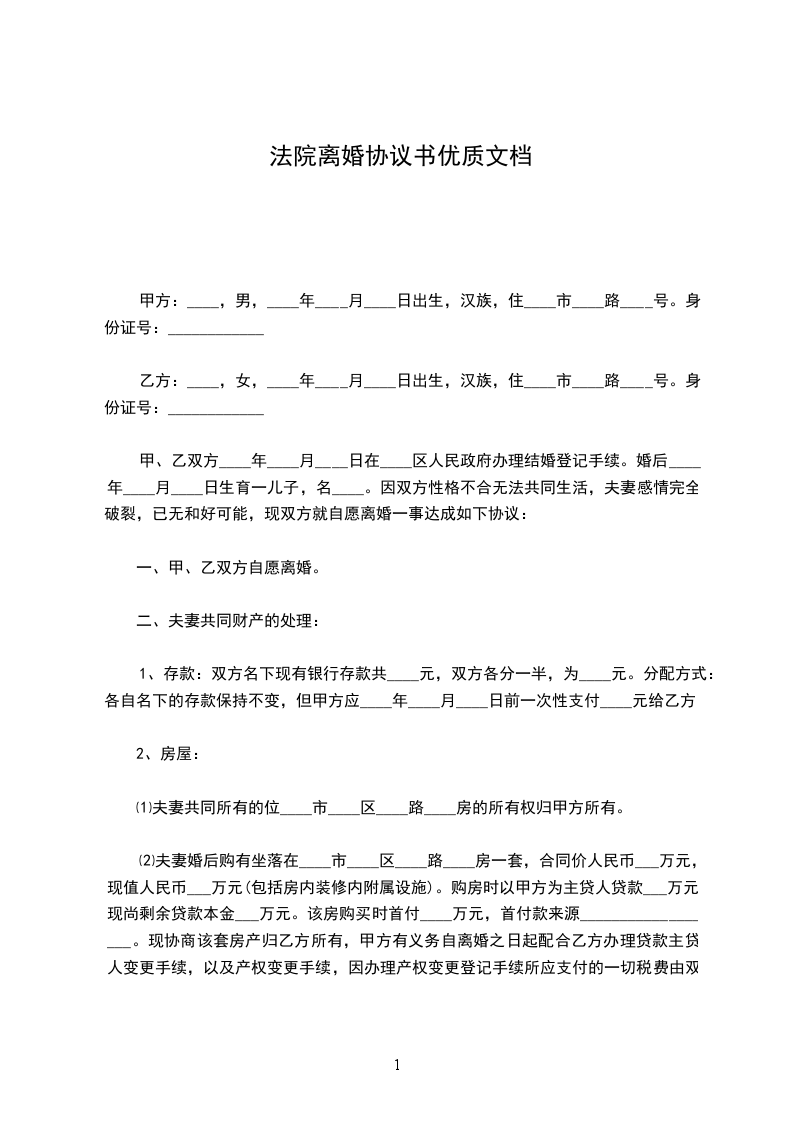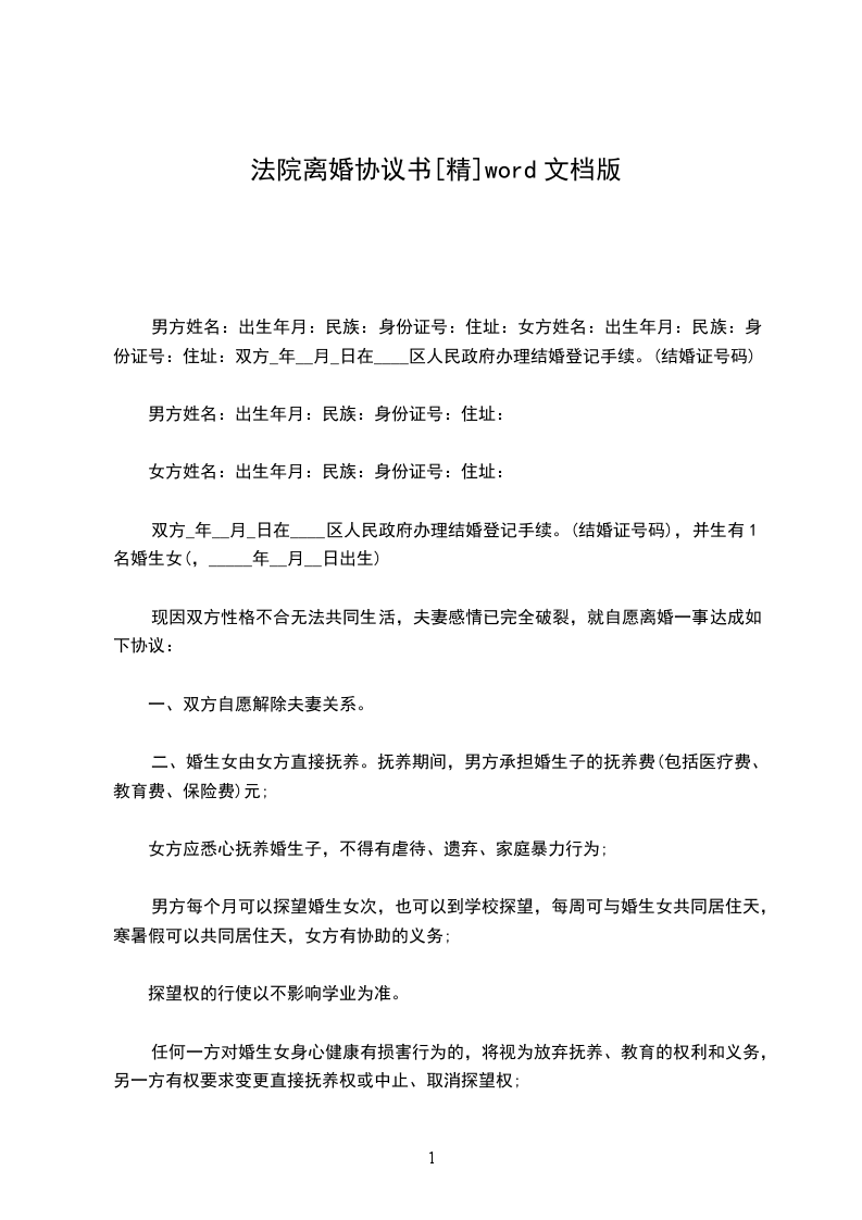 男方与女方_年_月认识,_年__月_日在登记结婚,婚后_年__月_日生育一儿子/女儿,名。因致使夫妻感情破裂,已无和好可能,现经夫妻双方自愿协商达成一致意见,订立离婚协议如下: