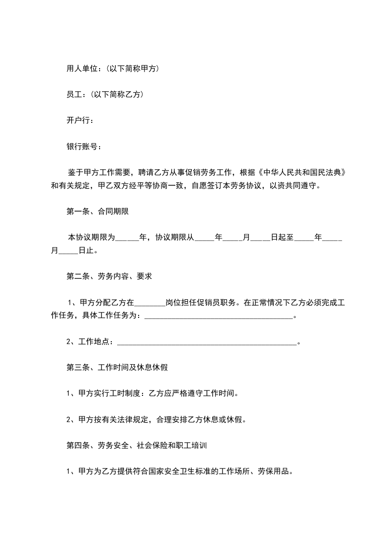 1、甲方分配乙方在________岗位担任促销员职务。在正常情况下乙方必须完成工作任务,具体工作任务为:______________________________________。