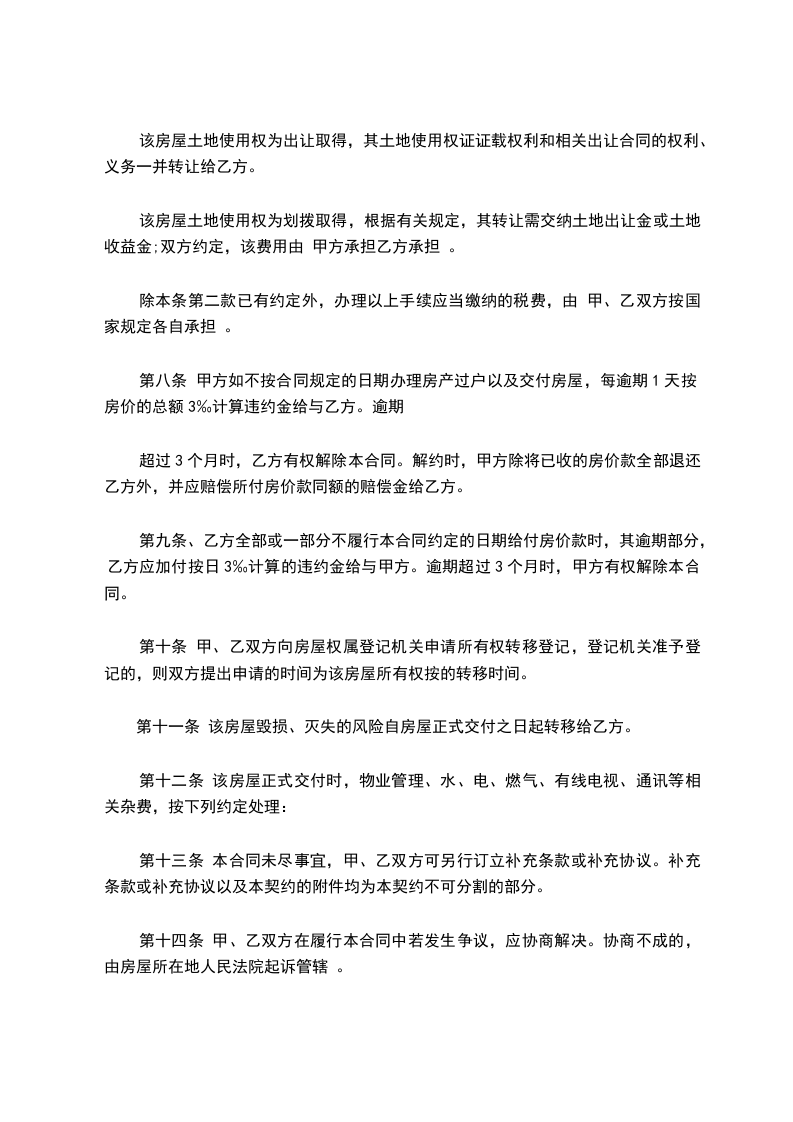 七、办理房产证手续所产生的有关税费由乙方承担。甲方应在____________________________将该房产交付乙方。届时该房产应无任何担保、抵押、房产瑕疵,无人租住、使用,无欠账,如电话费、水电费、物业管理费、取暖费、网费、有线电视费等。