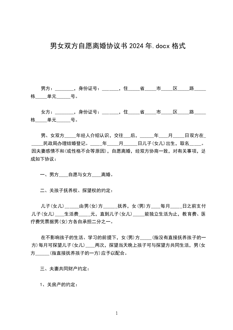 男方与女方_年_月认识,_年__月_日在登记结婚,婚后_年__月_日生育一儿子/女儿,名。因致使夫妻感情破裂,已无和好可能,现经夫妻双方自愿协商达成一致意见,订立离婚协议如下: