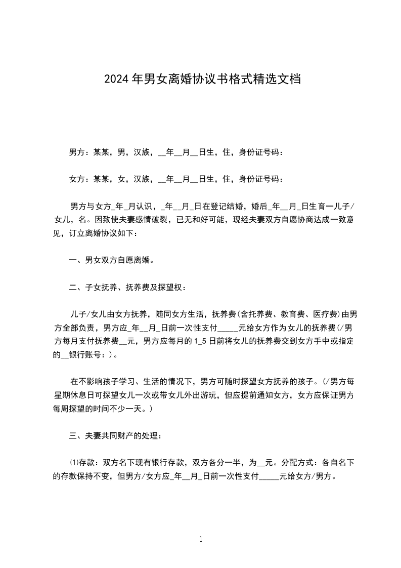 ⑴存款:双方名下现有银行存款,双方各分一半,为__元。分配方式:各自名下的存款保持不变,但男方/女方应_年__月_日前一次性支付_____元给女方/男方。