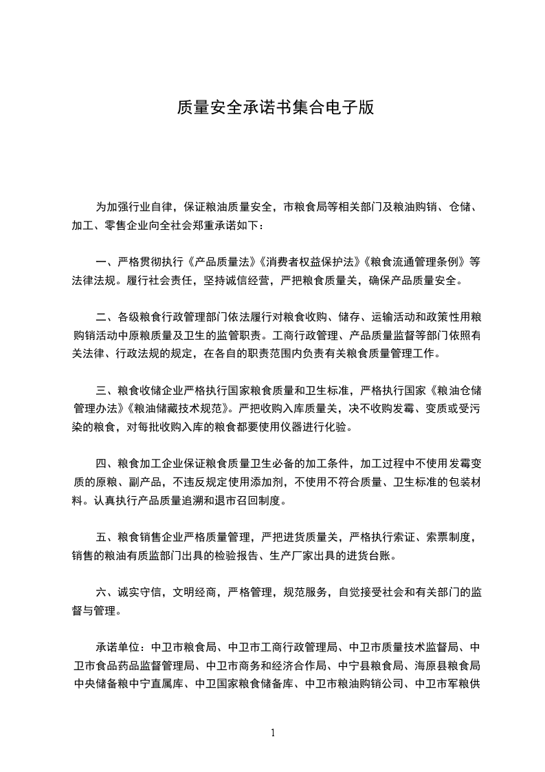 承诺单位:中卫市粮食局、中卫市工商行政管理局、中卫市质量技术监督局、中卫市食品药品监督管理局、中卫市商务和经济合作局、中宁县粮食局、海原县粮食局、中央储备粮中宁直属库、中卫国家粮食储备库、中卫市粮油购销公司、中卫市军粮供应站、宁夏三鑫源粮油贸易有限公司、宁夏鑫正源面业有限公司、宁夏万齐米业有限公司、中卫市鑫裕民粮油工贸有限公司、中卫市鑫宏米业有限公司、中卫市鑫雪丰粮油加工有限公司、中卫市中昊粮油加工有限责任公司、中卫市宁香源食品加工有限公司、中卫市金麦子粮油综合加工厂、中卫市鑫宝丰工贸有限责任公司、中卫市隆裕米业有限公司、中卫市金福面粉加工厂、中卫市利禾粮油销售部、中卫荣盛超级市场有限责任公司、宁夏德林商贸有限公司、银川市新华百货连锁超市有限公司中卫店、宁夏华润万家生活超市有限公司中卫分公司、中宁县禹王面粉有限公司、中宁县军粮供应站、中宁县丰泽粮油贸易有限公司、中宁县万宝粮油商贸有限公司、宁夏亨源粮油有限公司。共33个单位。