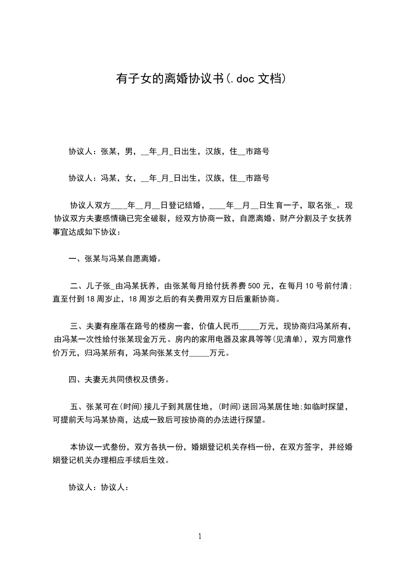 协议人双方____年__月__日登记结婚,____年__月__日生育一子,取名张_。现协议双方夫妻感情确已完全破裂,经双方协商一致,自愿离婚、财产分割及子女抚养事宜达成如下协议:
