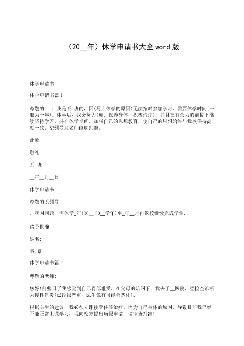 休学申请书篇3尊敬的___:我是系_班的,因(写上休学的原因)无法按时参加学习,需要休学时间(一般为一年)。休学后,我会努力(如:保养身体,积极治疗),并且在有余力的前提下继续坚持学习。并在休学期间,加强自己的思想教育,使自己的思想始终与我校保持高度一致。望领导及老师能够批准。